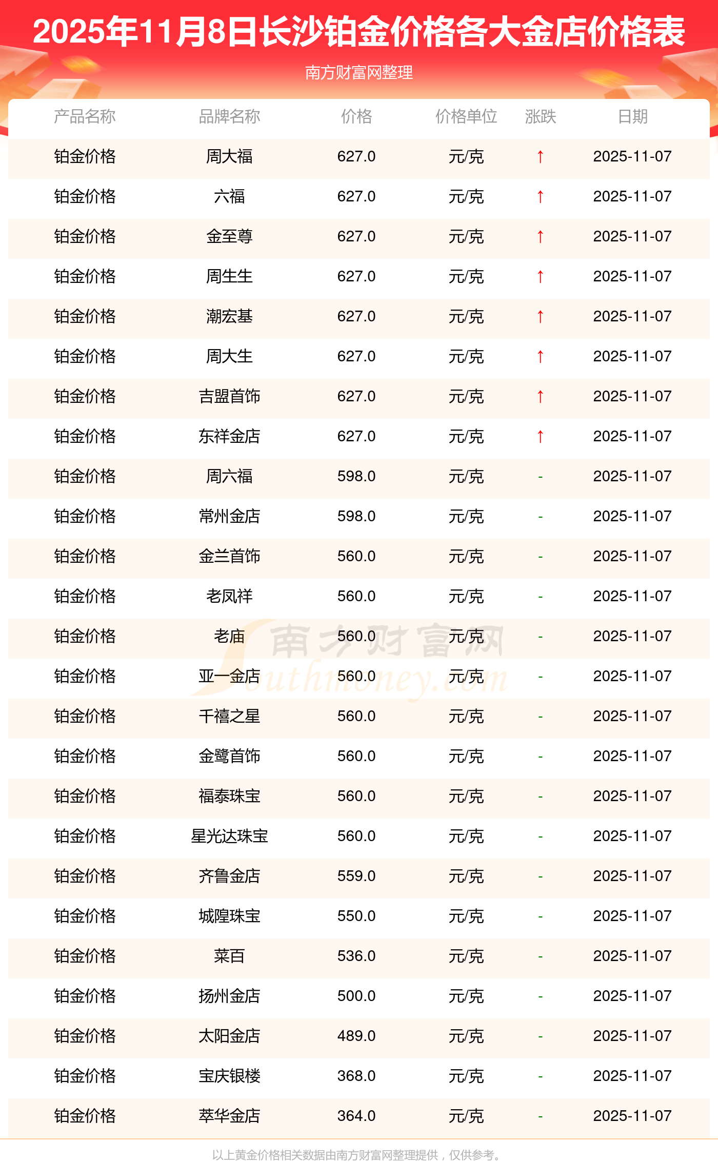 2025年11月8日長沙寶泉錢幣、金蘭首飾、金蘭首飾、謝瑞麟、謝瑞麟、謝瑞麟、謝瑞麟、謝瑞麟、金銀街、金銀街、金銀街等各大金店品牌鉑金價格最新價格行情來了,如下:寶泉錢幣銀條價格11.4元/克,金蘭首飾黃金價格1263.0元/克,金蘭首飾鉑金價格560.0元/克,謝瑞麟金條價格(內地)1202.0元/克,謝瑞麟金飾價格(內地)1268.0元/克,謝瑞麟黃金飾品(香港)44260.0,謝瑞麟鉑金飾品(香港)13080.0,謝瑞麟金條金價(香港)39960.0,金銀街投資金條1243.0元/克,金銀街工藝金條1258.0元/克,金銀街千足金首飾1248.0元/克。