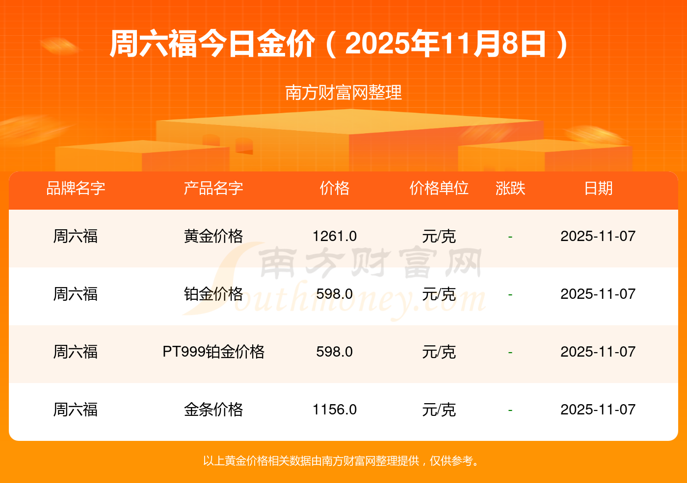 2025年11月8日周六福金價查詢:銀條價格11.4元/克,黃金價格1263.0元/克,鉑金價格560.0元/克,金條價格(內(nèi)地)1202.0元/克,金飾價格(內(nèi)地)1268.0元/克,黃金飾品(香港)44260.0,鉑金飾品(香港)13080.0,金條金價(香港)39960.0,投資金條1243.0元/克,工藝金條1258.0元/克,千足金首飾1248.0元/克。
