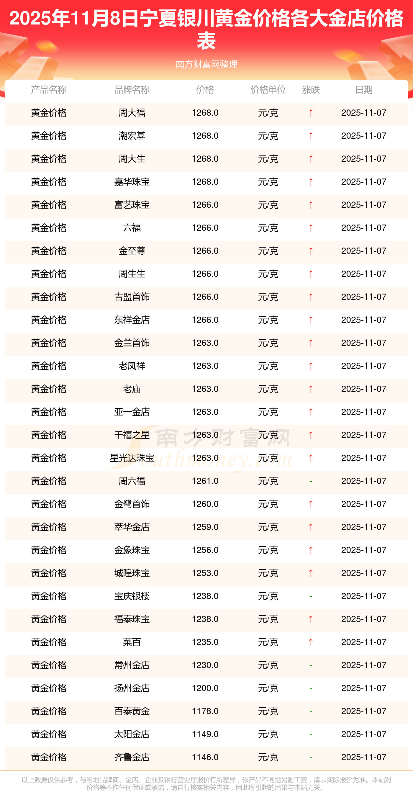 2025年11月8日,寧夏銀川寶泉錢幣、金蘭首飾、金蘭首飾、謝瑞麟、謝瑞麟、謝瑞麟、謝瑞麟、謝瑞麟、金銀街、金銀街、金銀街等各大金店品牌黃金價(jià)格今日價(jià)格行情最新來(lái)了:寶泉錢幣11.4元/克、金蘭首飾1263.0元/克、金蘭首飾560.0元/克、謝瑞麟1202.0元/克、謝瑞麟1268.0元/克、謝瑞麟44260.0、謝瑞麟13080.0、謝瑞麟39960.0、金銀街1243.0元/克、金銀街1258.0元/克、金銀街1248.0元/克。