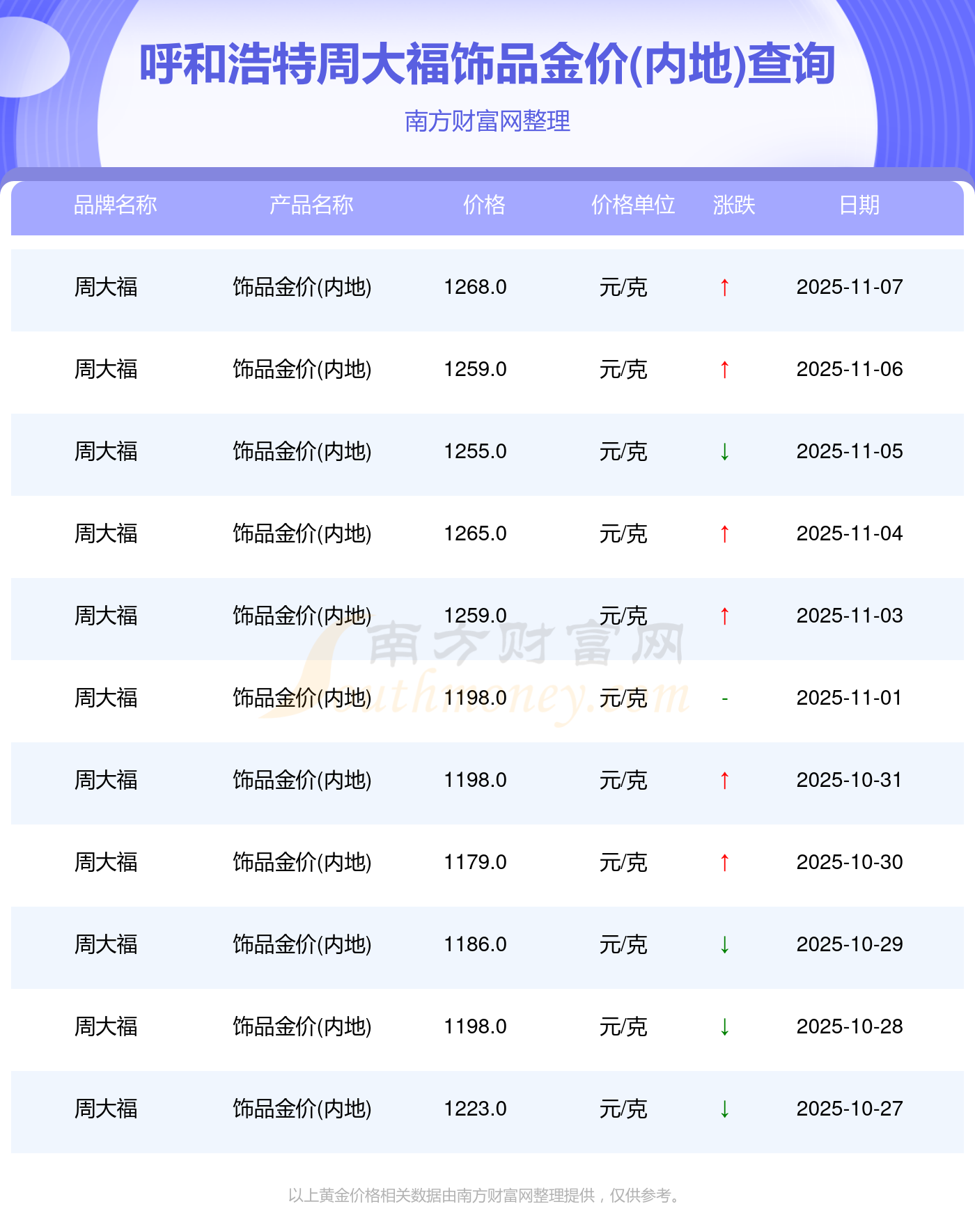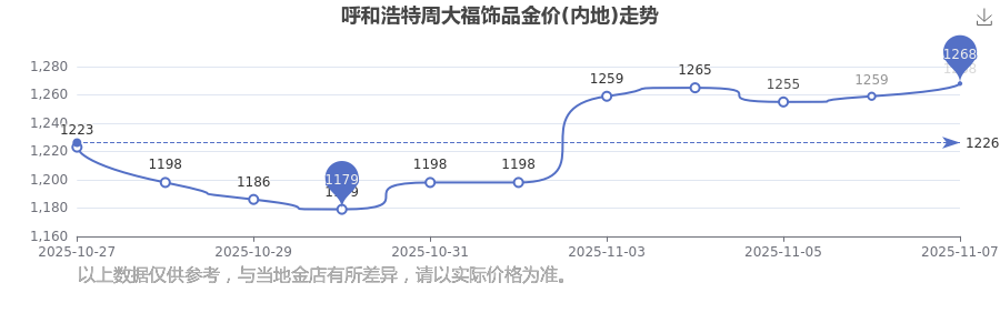 今日呼和浩特周大福飾品金價(內(nèi)地)最新為:1268.0元/克。