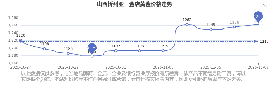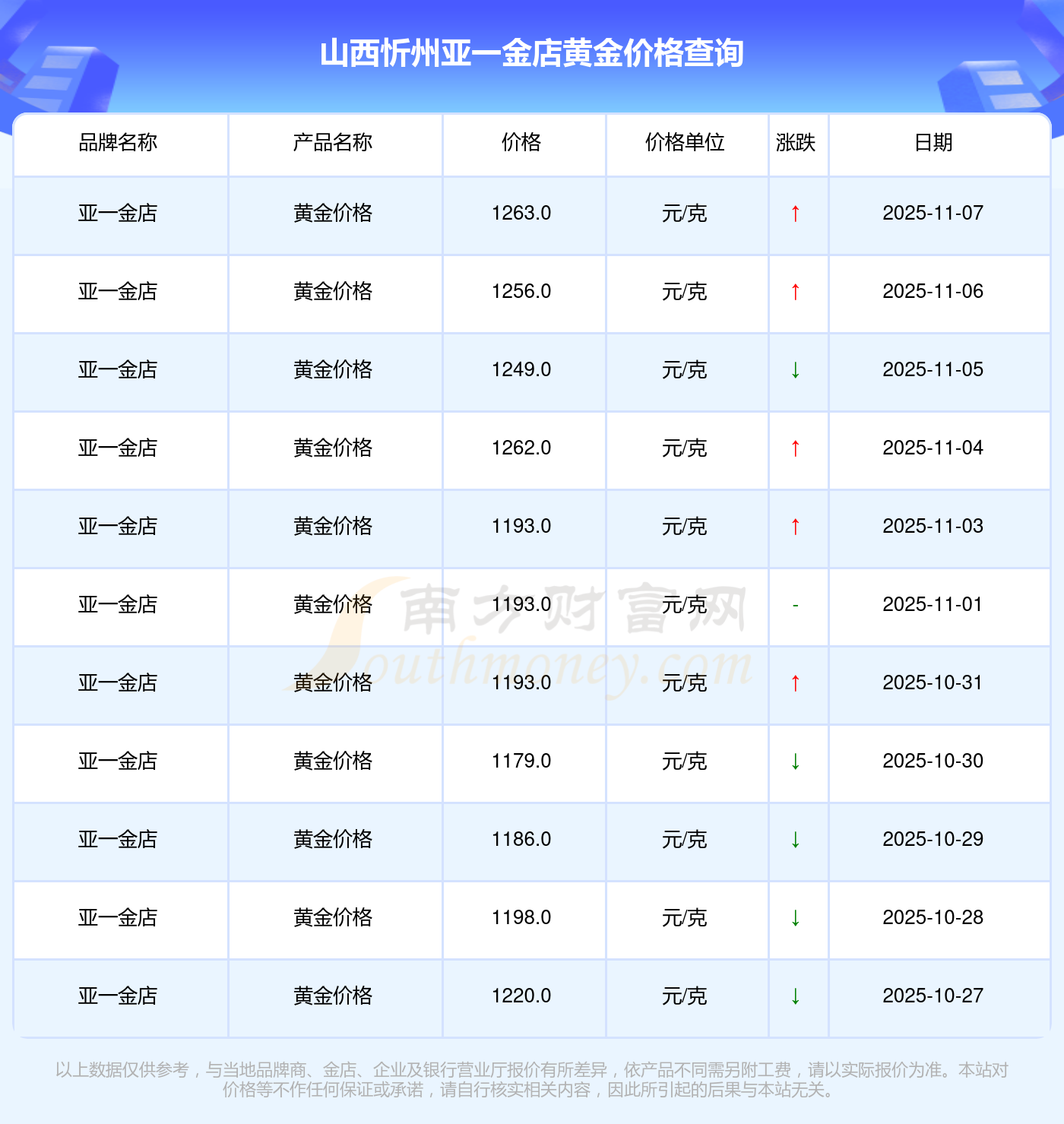 今日(2025年11月8日)山西忻州亞一金店黃金價格是1263.0元/克。