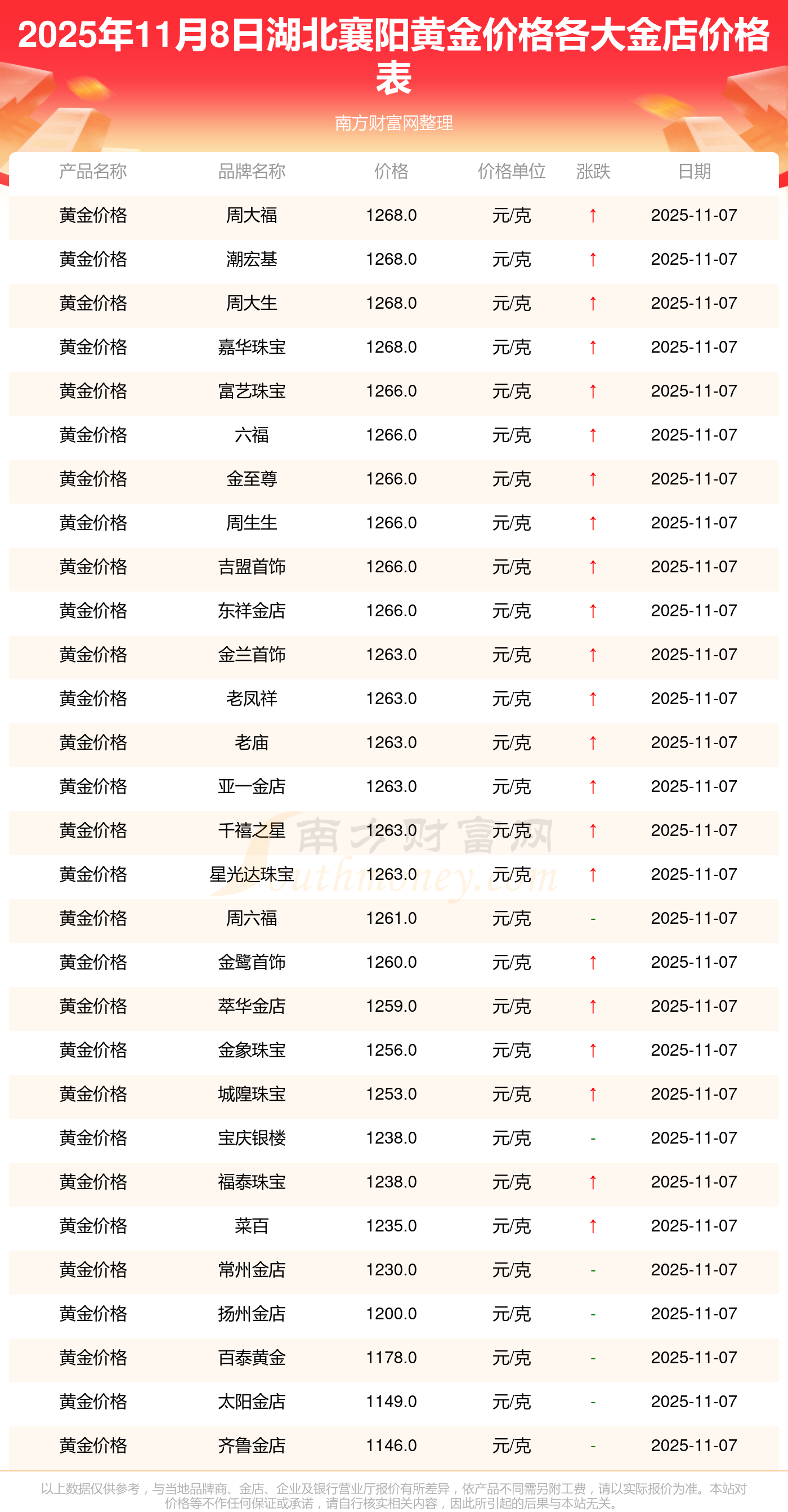 2025年11月8日湖北襄陽(yáng)各金店黃金價(jià)格最新一覽表