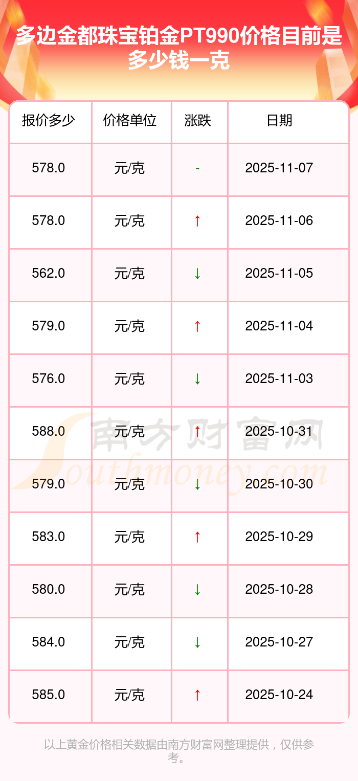 今日多邊金都珠寶 鉑金PT990價格,最新確定為578.0元/克。