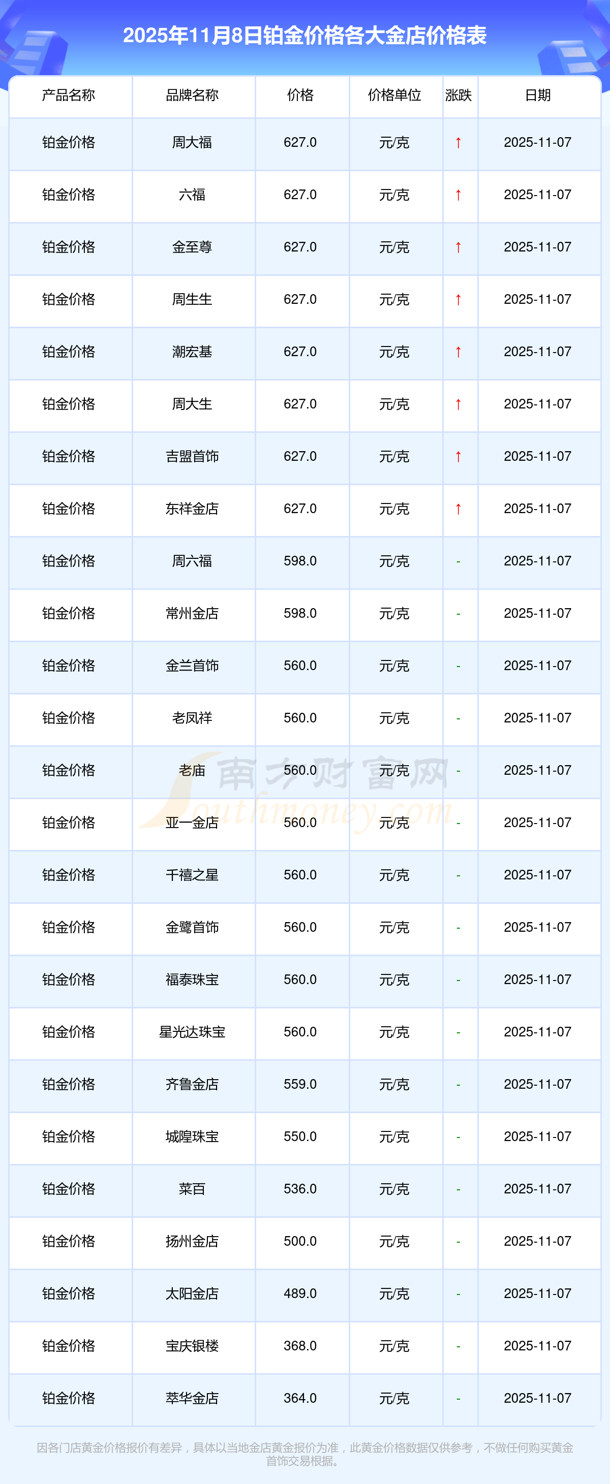 2025年11月8日各大金店鉑金價格最新價格:寶泉錢幣11.4元/克,金蘭首飾1263.0元/克,金蘭首飾560.0元/克,謝瑞麟1202.0元/克,謝瑞麟1268.0元/克,謝瑞麟44260.0,謝瑞麟13080.0,謝瑞麟39960.0,金銀街1243.0元/克,金銀街1258.0元/克,金銀街1248.0元/克。