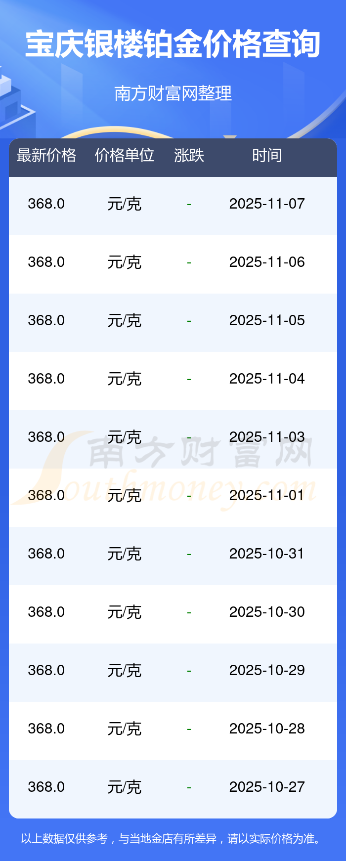 今日(2025年11月8日)寶慶銀樓鉑金價格的價格為368.0元/克。