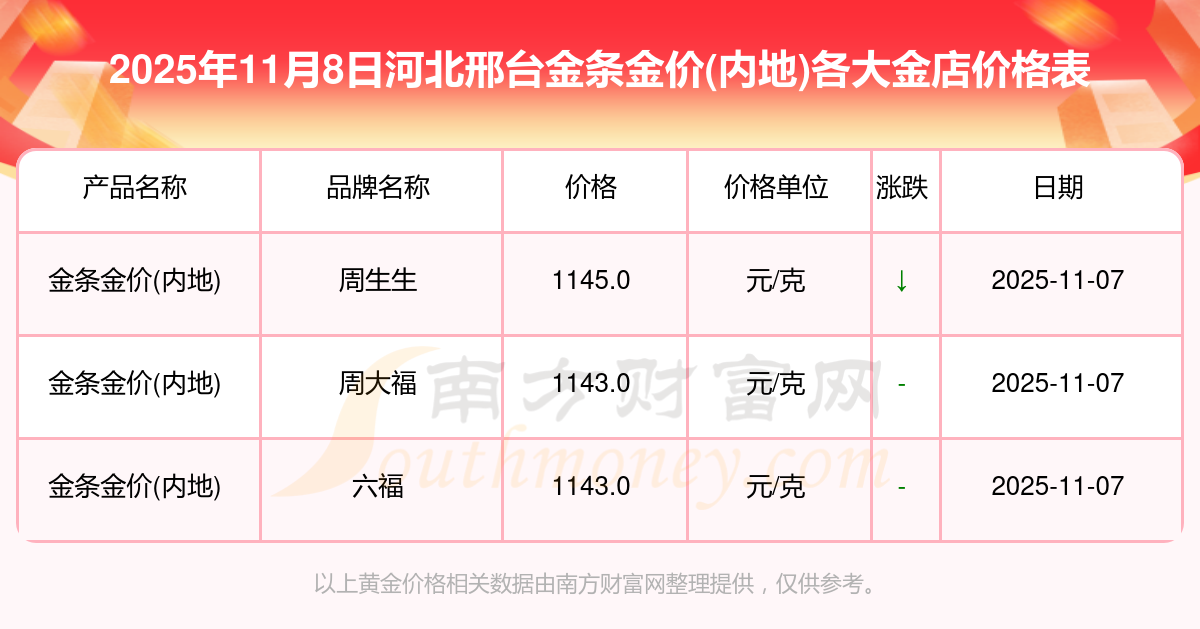 2025年11月8日,河北邢臺寶泉錢幣、金蘭首飾、金蘭首飾、謝瑞麟、謝瑞麟、謝瑞麟、謝瑞麟、謝瑞麟、金銀街、金銀街、金銀街等各大金店品牌金條金價(內(nèi)地)今日價格行情最新來了:寶泉錢幣11.4元/克、金蘭首飾1263.0元/克、金蘭首飾560.0元/克、謝瑞麟1202.0元/克、謝瑞麟1268.0元/克、謝瑞麟44260.0、謝瑞麟13080.0、謝瑞麟39960.0、金銀街1243.0元/克、金銀街1258.0元/克、金銀街1248.0元/克。