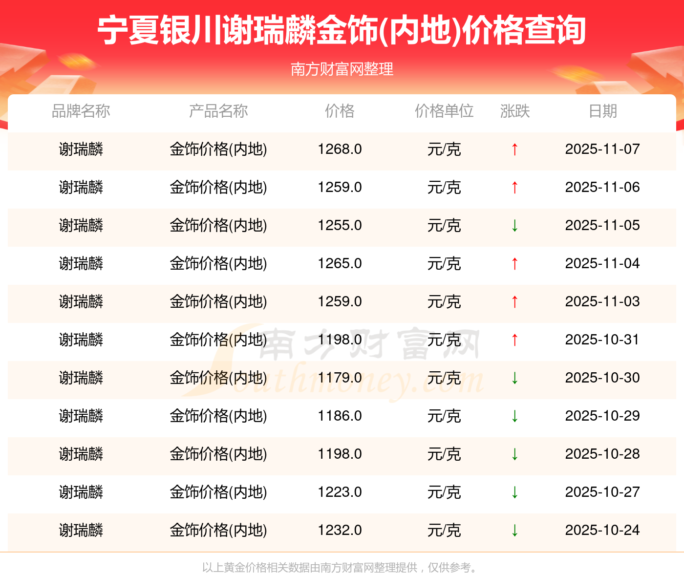 2025年11月8日,今日寧夏銀川謝瑞麟金飾(內(nèi)地)價格:1268.0元/克。