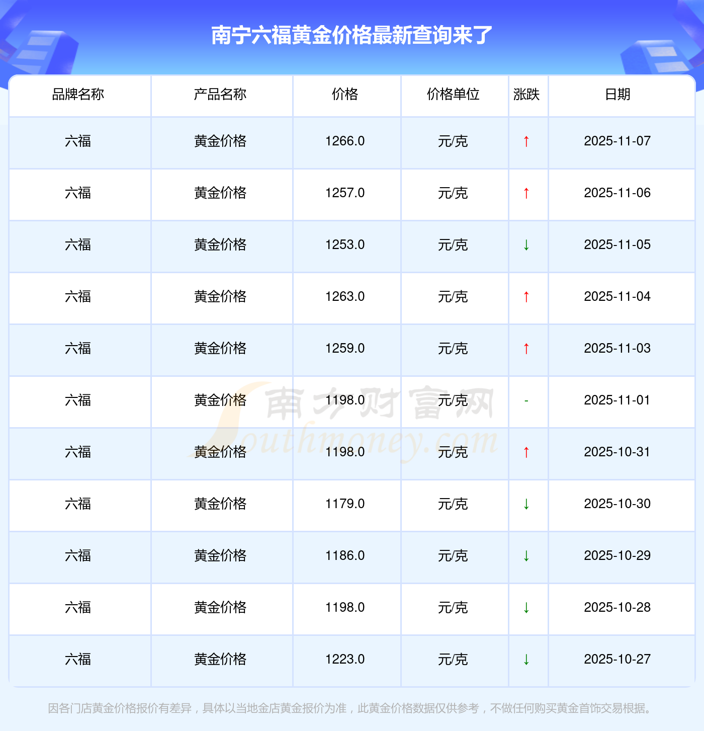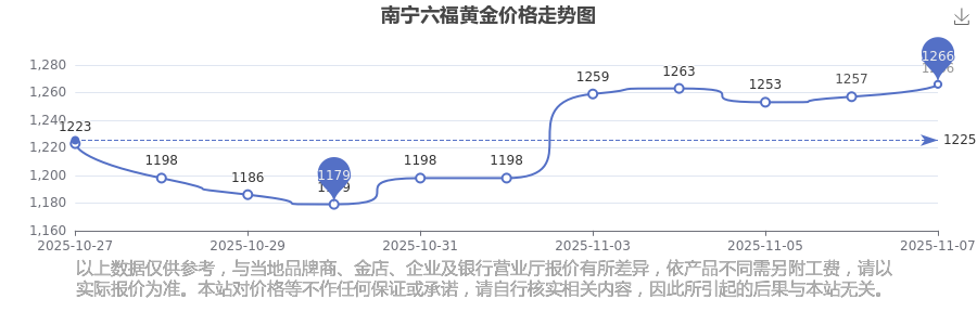 今日(2025年11月8日),南寧六福黃金價格:1266.0元/克。