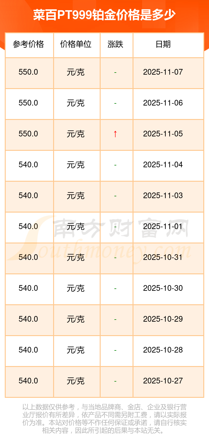 菜百今日PT999鉑金的最新標(biāo)價為550.0元/克。