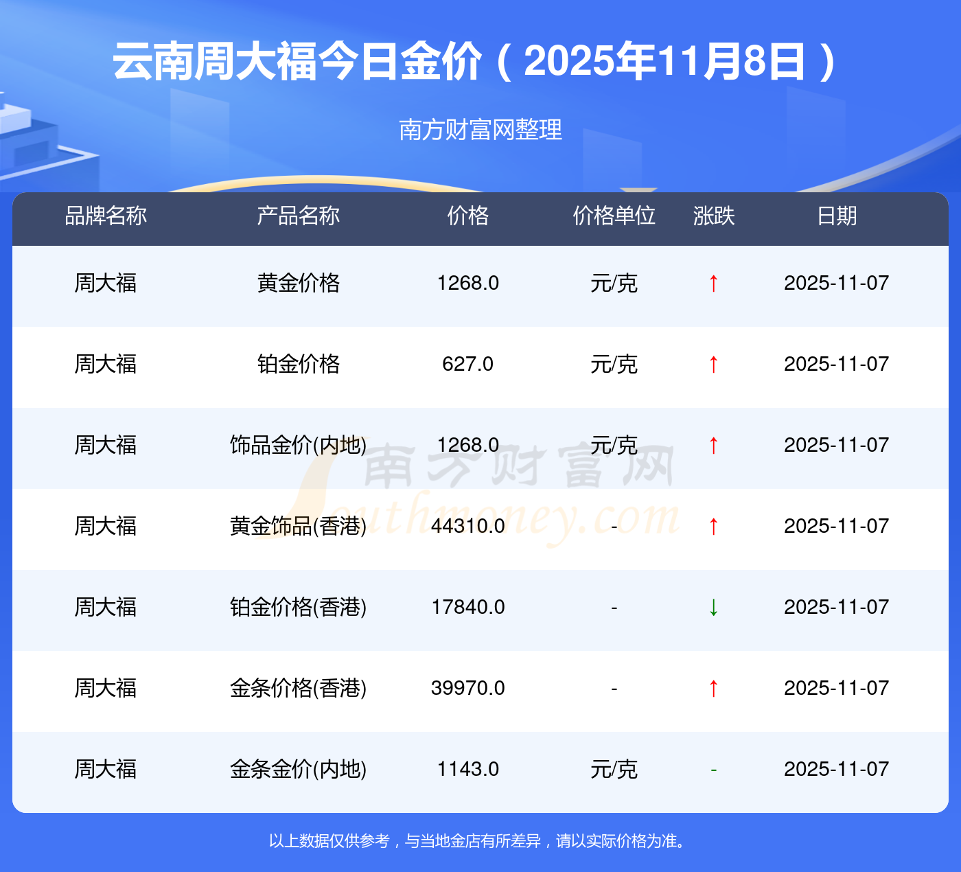 想查詢今日黃金價(jià)格,當(dāng)下黃金一克具體售價(jià)幾何? 云南周大福金價(jià)今日價(jià)格:銀條價(jià)格11.4元/克,黃金價(jià)格1263.0元/克,鉑金價(jià)格560.0元/克,金條價(jià)格(內(nèi)地)1202.0元/克,金飾價(jià)格(內(nèi)地)1268.0元/克,黃金飾品(香港)44260.0,鉑金飾品(香港)13080.0,金條金價(jià)(香港)39960.0,投資金條1243.0元/克,工藝金條1258.0元/克,千足金首飾1248.0元/克。