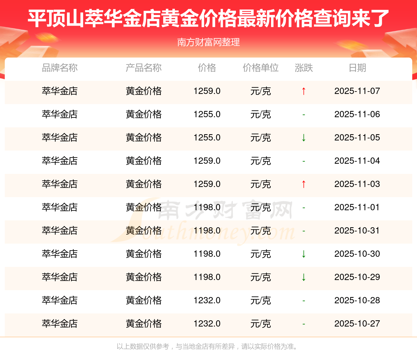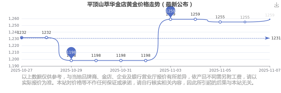 2025年11月8日這一天,平頂山萃華金店的黃金價(jià)格以 1259.0元/克的價(jià)格售賣。