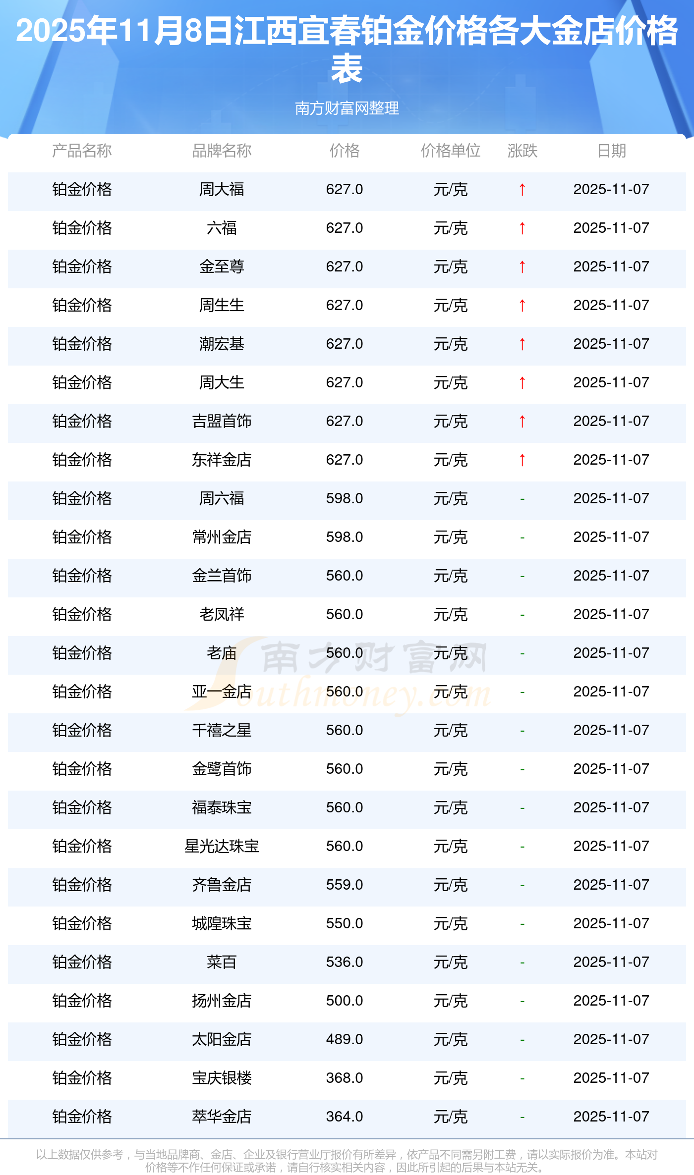 今天是2025年11月8日,江西宜春寶泉錢幣、金蘭首飾、金蘭首飾、謝瑞麟、謝瑞麟、謝瑞麟、謝瑞麟、謝瑞麟、金銀街、金銀街、金銀街等各大金店品牌鉑金價格最新價格如下:寶泉錢幣11.4元/克、金蘭首飾1263.0元/克、金蘭首飾560.0元/克、謝瑞麟1202.0元/克、謝瑞麟1268.0元/克、謝瑞麟44260.0、謝瑞麟13080.0、謝瑞麟39960.0、金銀街1243.0元/克、金銀街1258.0元/克、金銀街1248.0元/克。