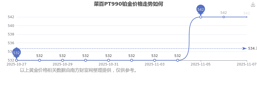 今日(2025年11月8日)菜百PT990鉑金價格是542.0元/克。