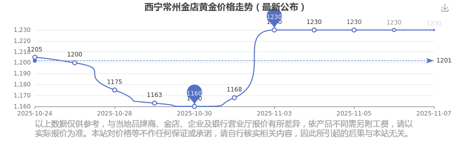 于 2025年11月8日,西寧常州金店黃金價格的克價為1230.0元/克。