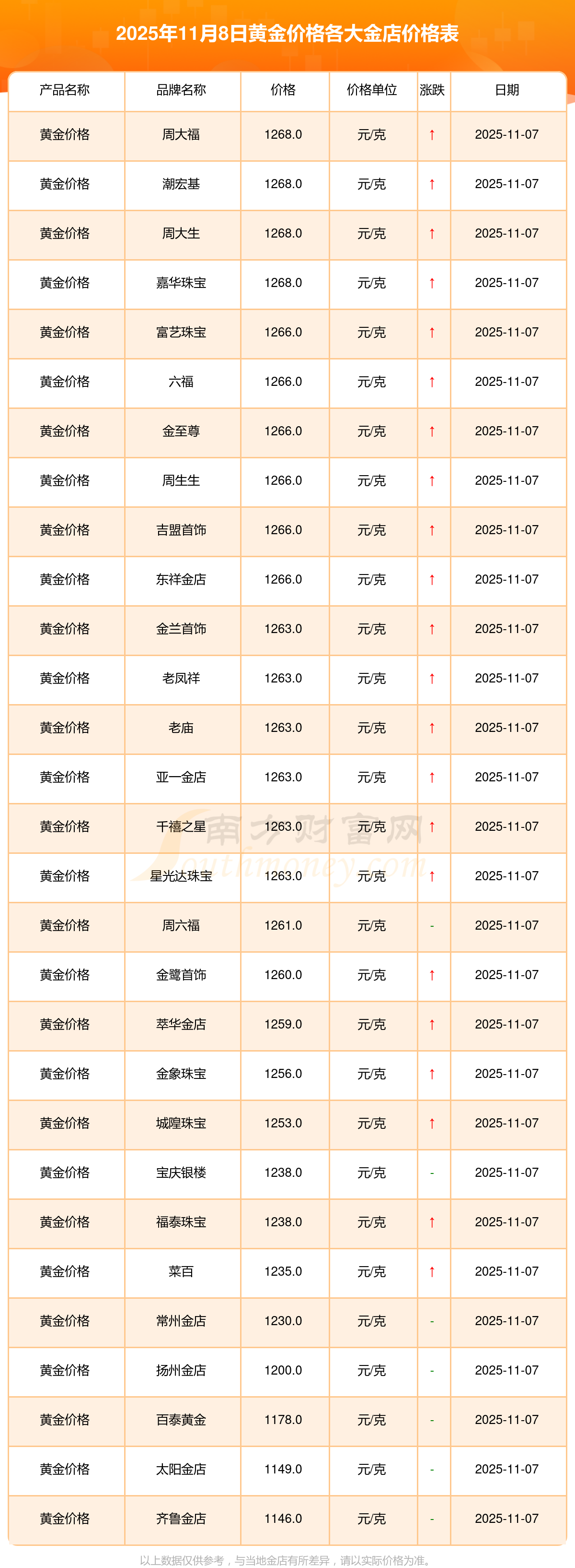今天是2025年11月8日,寶泉錢(qián)幣、金蘭首飾、金蘭首飾、謝瑞麟、謝瑞麟、謝瑞麟、謝瑞麟、謝瑞麟、金銀街、金銀街、金銀街等各大金店品牌黃金價(jià)格最新價(jià)格如下:寶泉錢(qián)幣11.4元/克、金蘭首飾1263.0元/克、金蘭首飾560.0元/克、謝瑞麟1202.0元/克、謝瑞麟1268.0元/克、謝瑞麟44260.0、謝瑞麟13080.0、謝瑞麟39960.0、金銀街1243.0元/克、金銀街1258.0元/克、金銀街1248.0元/克。