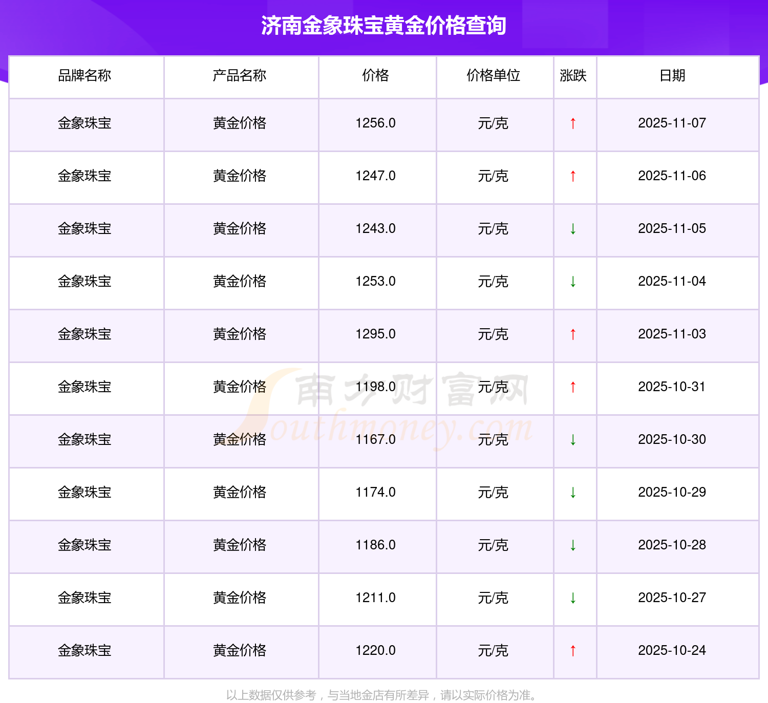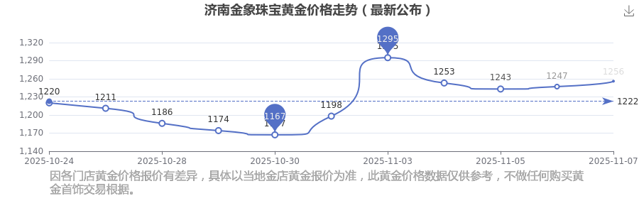 今日(2025年11月8日),濟南金象珠寶黃金價格:1256.0元/克。