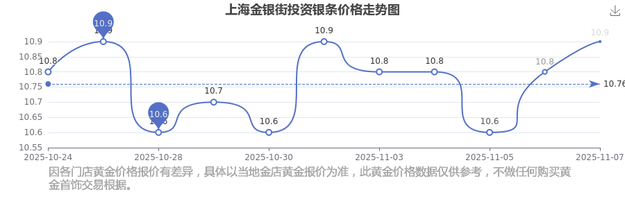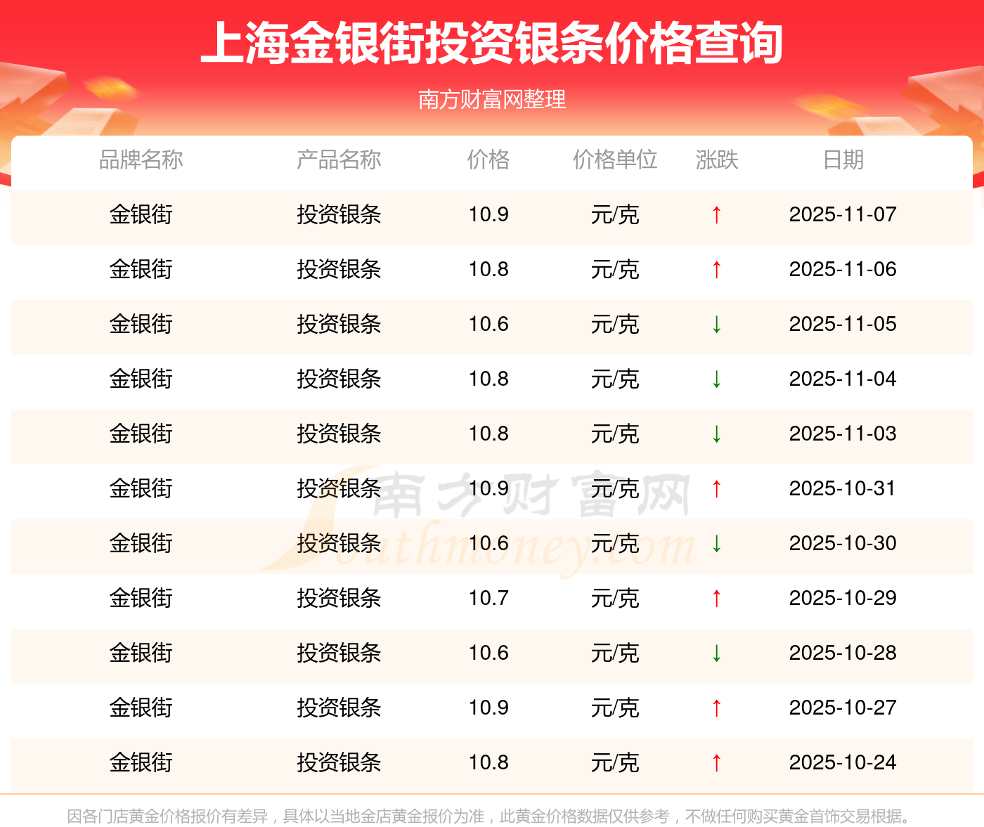 今日上海金銀街投資銀條的價格為10.9元/克。