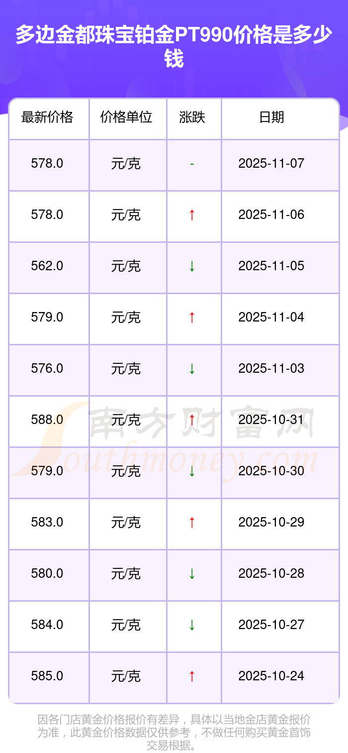 578.0元/克是多邊金都珠寶在今日給出的 鉑金PT990最新價(jià)格。