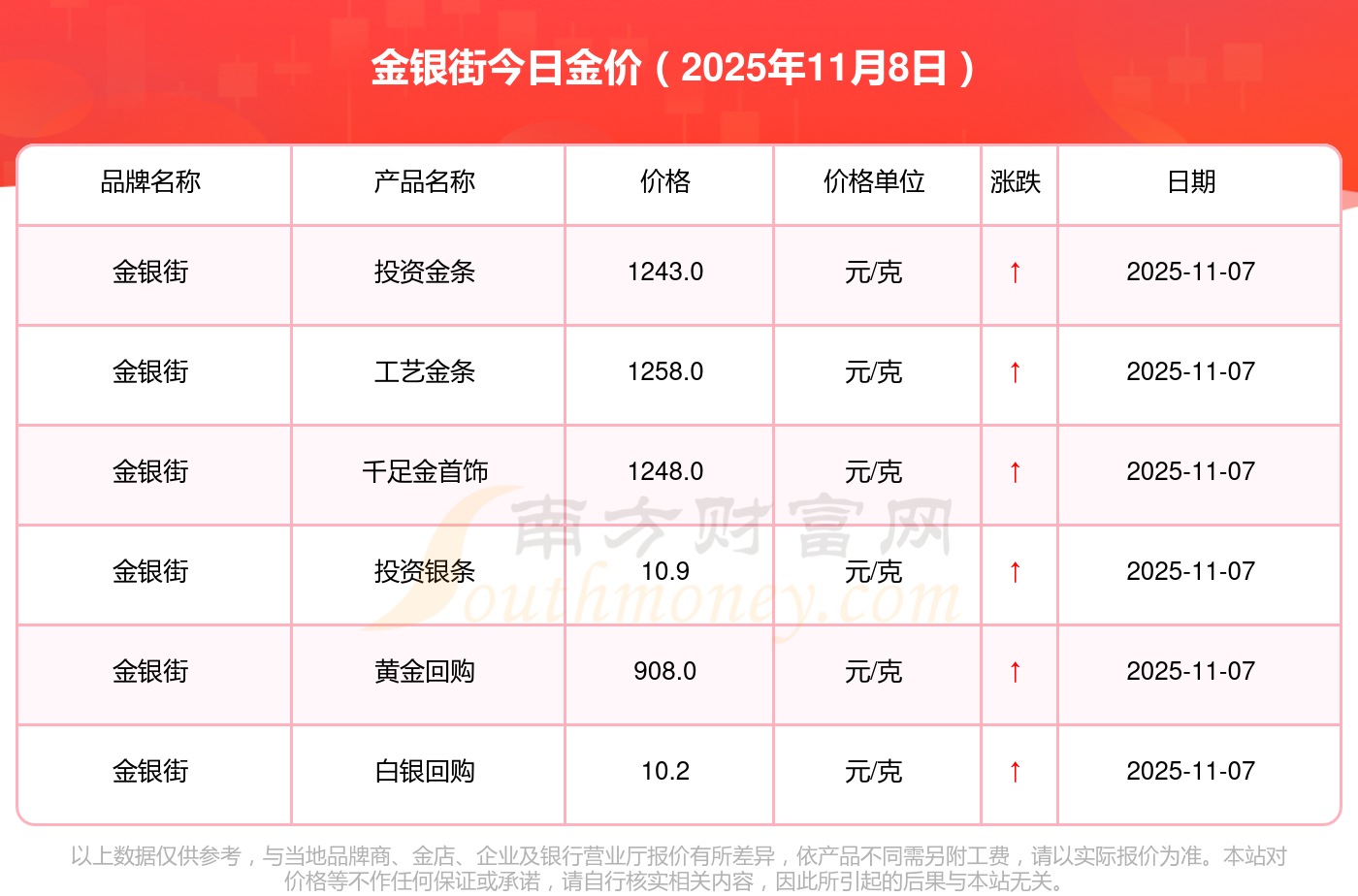 金銀街現(xiàn)在金價多少錢一克?金銀街今天白銀回購價格多少一克?最新金銀街查詢,2025年11月8日金銀街白銀回購現(xiàn)在每克多少錢?最新金銀街白銀回購報價公布,一起來看看吧!