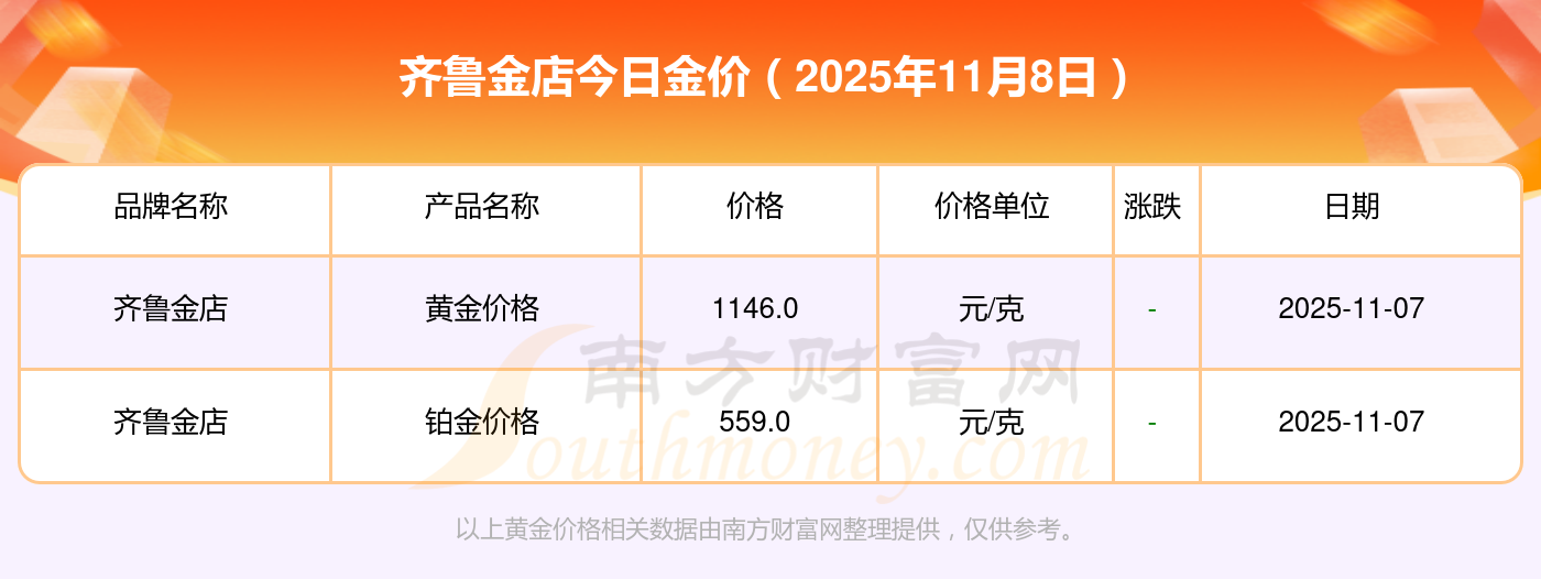今天是2025年11月8日,寶泉錢幣、金蘭首飾、金蘭首飾、謝瑞麟、謝瑞麟、謝瑞麟、謝瑞麟、謝瑞麟、金銀街、金銀街、金銀街等各大金店品牌黃金價格最新價格如下:寶泉錢幣11.4元/克、金蘭首飾1263.0元/克、金蘭首飾560.0元/克、謝瑞麟1202.0元/克、謝瑞麟1268.0元/克、謝瑞麟44260.0、謝瑞麟13080.0、謝瑞麟39960.0、金銀街1243.0元/克、金銀街1258.0元/克、金銀街1248.0元/克。