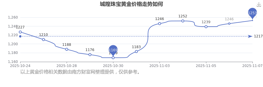 今日城隍珠寶黃金價格最新價格為1253.0元/克。