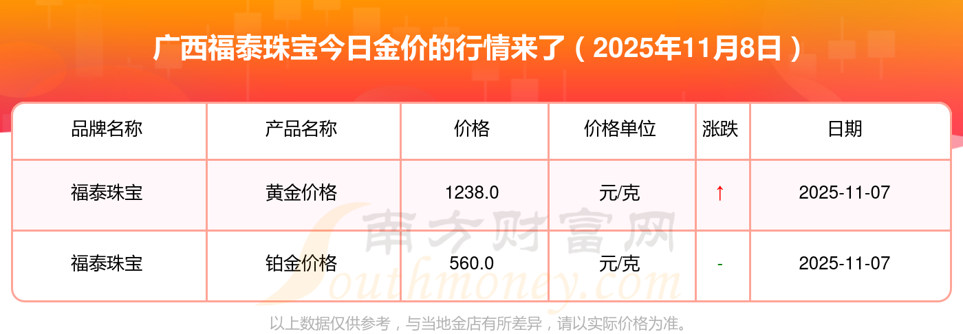 今天黃金價格行情如何?現(xiàn)在一克黃金的售價是多少?2025年11月8日廣西福泰珠寶今日價格:銀條價格11.4元/克,黃金價格1263.0元/克,鉑金價格560.0元/克,金條價格(內(nèi)地)1202.0元/克,金飾價格(內(nèi)地)1268.0元/克,黃金飾品(香港)44260.0,鉑金飾品(香港)13080.0,金條金價(香港)39960.0,投資金條1243.0元/克,工藝金條1258.0元/克,千足金首飾1248.0元/克。