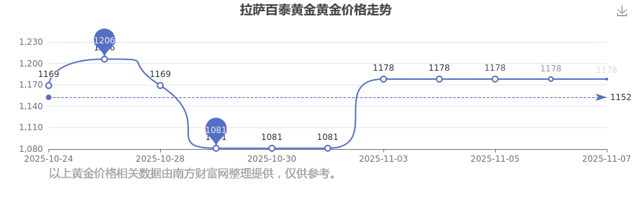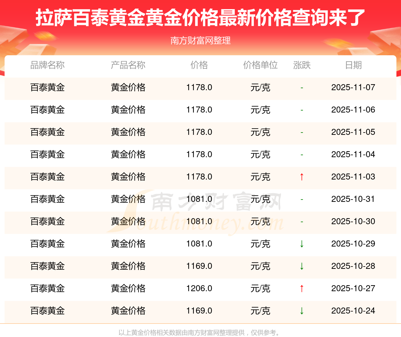 2025年11月8日當(dāng)天,拉薩百泰黃金黃金價格的單價是 1178.0元/克。