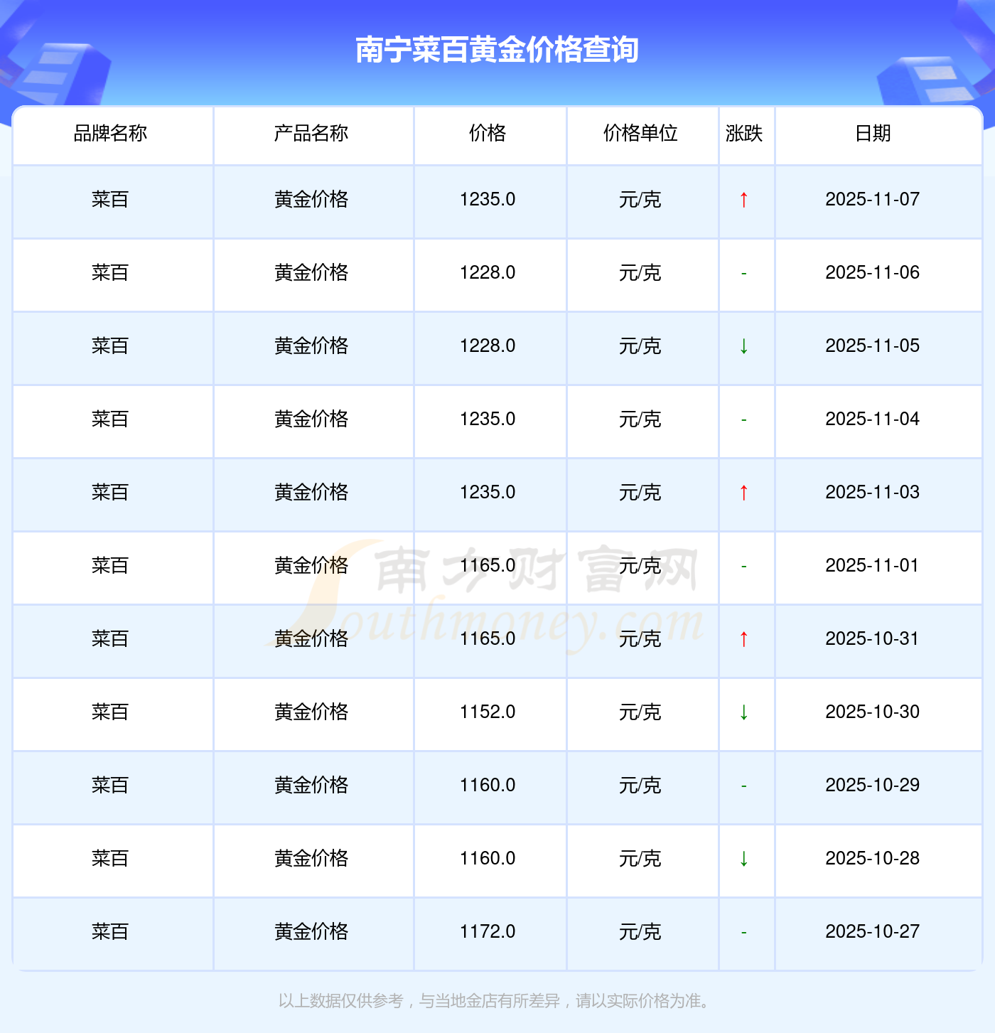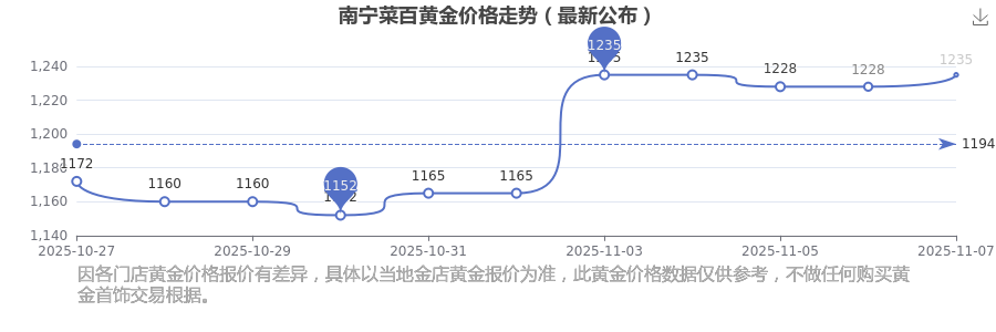 2025年11月8日南寧菜百黃金價(jià)格是1235.0元/克。