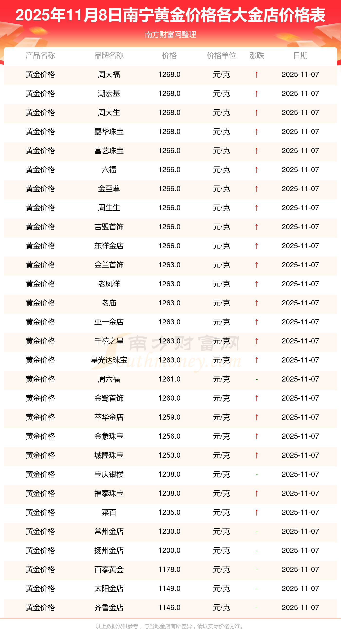 今天是2025年11月8日,南寧寶泉錢幣、金蘭首飾、金蘭首飾、謝瑞麟、謝瑞麟、謝瑞麟、謝瑞麟、謝瑞麟、金銀街、金銀街、金銀街等各大金店品牌黃金價格最新價格行情是這樣的:寶泉錢幣11.4元/克、金蘭首飾1263.0元/克、金蘭首飾560.0元/克、謝瑞麟1202.0元/克、謝瑞麟1268.0元/克、謝瑞麟44260.0、謝瑞麟13080.0、謝瑞麟39960.0、金銀街1243.0元/克、金銀街1258.0元/克、金銀街1248.0元/克。