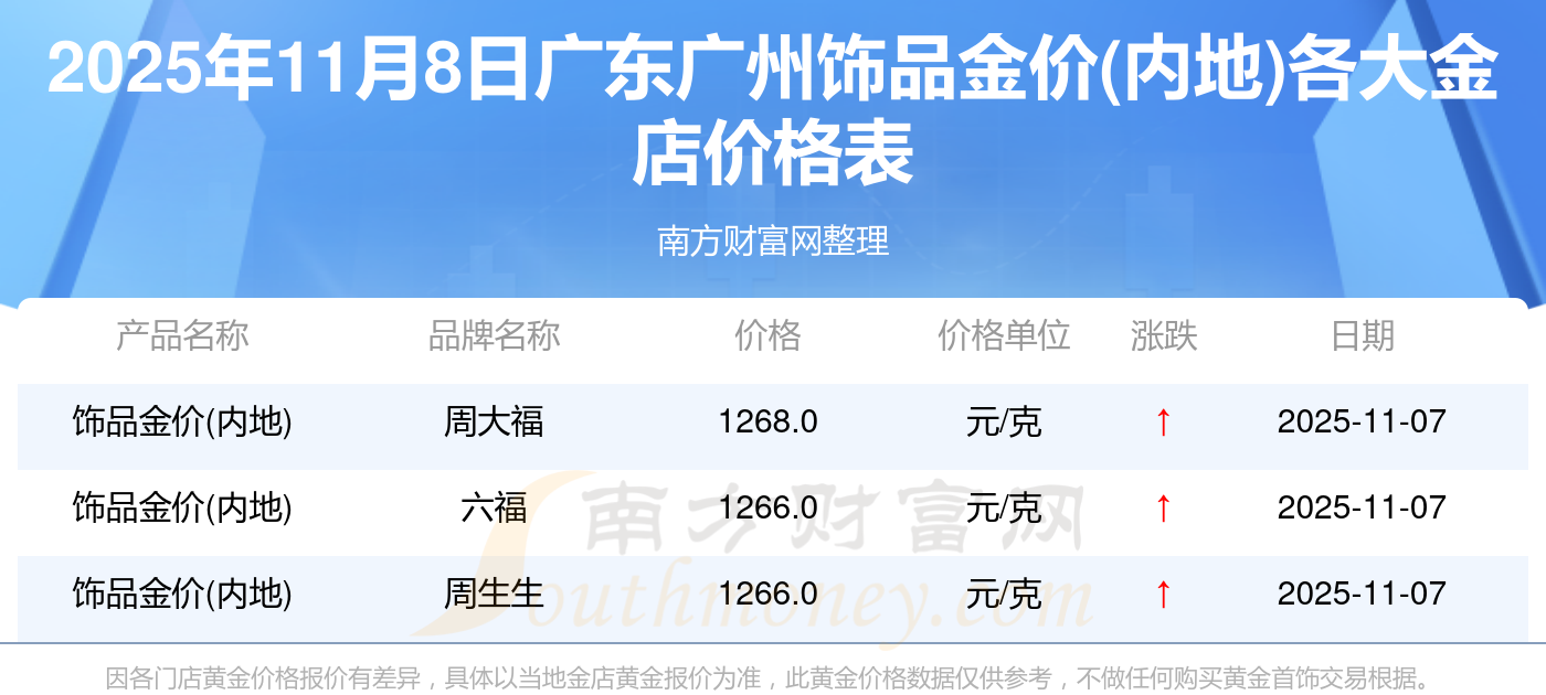 2025年11月8日,廣東廣州寶泉錢幣、金蘭首飾、金蘭首飾、謝瑞麟、謝瑞麟、謝瑞麟、謝瑞麟、謝瑞麟、金銀街、金銀街、金銀街等各大金店品牌飾品金價(jià)(內(nèi)地)今日價(jià)格如下:寶泉錢幣11.4元/克、金蘭首飾1263.0元/克、金蘭首飾560.0元/克、謝瑞麟1202.0元/克、謝瑞麟1268.0元/克、謝瑞麟44260.0、謝瑞麟13080.0、謝瑞麟39960.0、金銀街1243.0元/克、金銀街1258.0元/克、金銀街1248.0元/克。