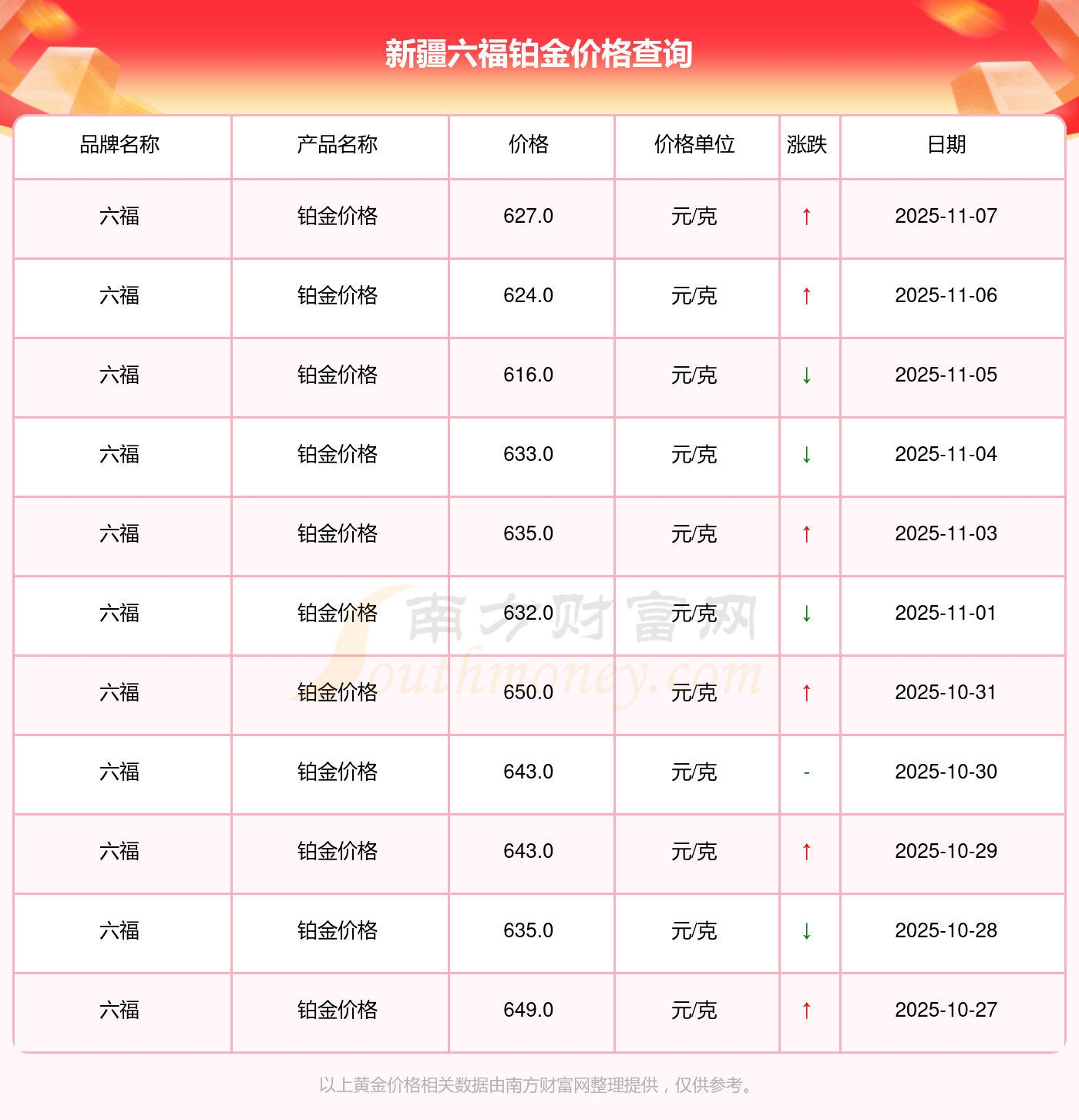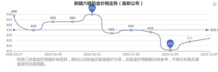 627.0元/克的鉑金價(jià)格,是新疆六福在 2025年11月8日給出的。