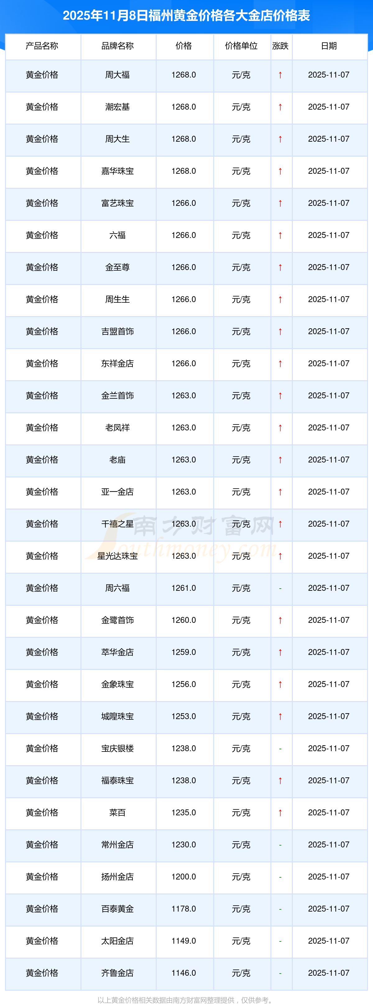 今天是2025年11月8日,福州寶泉錢幣、金蘭首飾、金蘭首飾、謝瑞麟、謝瑞麟、謝瑞麟、謝瑞麟、謝瑞麟、金銀街、金銀街、金銀街等各大金店品牌黃金價(jià)格最新價(jià)格如下:寶泉錢幣11.4元/克、金蘭首飾1263.0元/克、金蘭首飾560.0元/克、謝瑞麟1202.0元/克、謝瑞麟1268.0元/克、謝瑞麟44260.0、謝瑞麟13080.0、謝瑞麟39960.0、金銀街1243.0元/克、金銀街1258.0元/克、金銀街1248.0元/克。