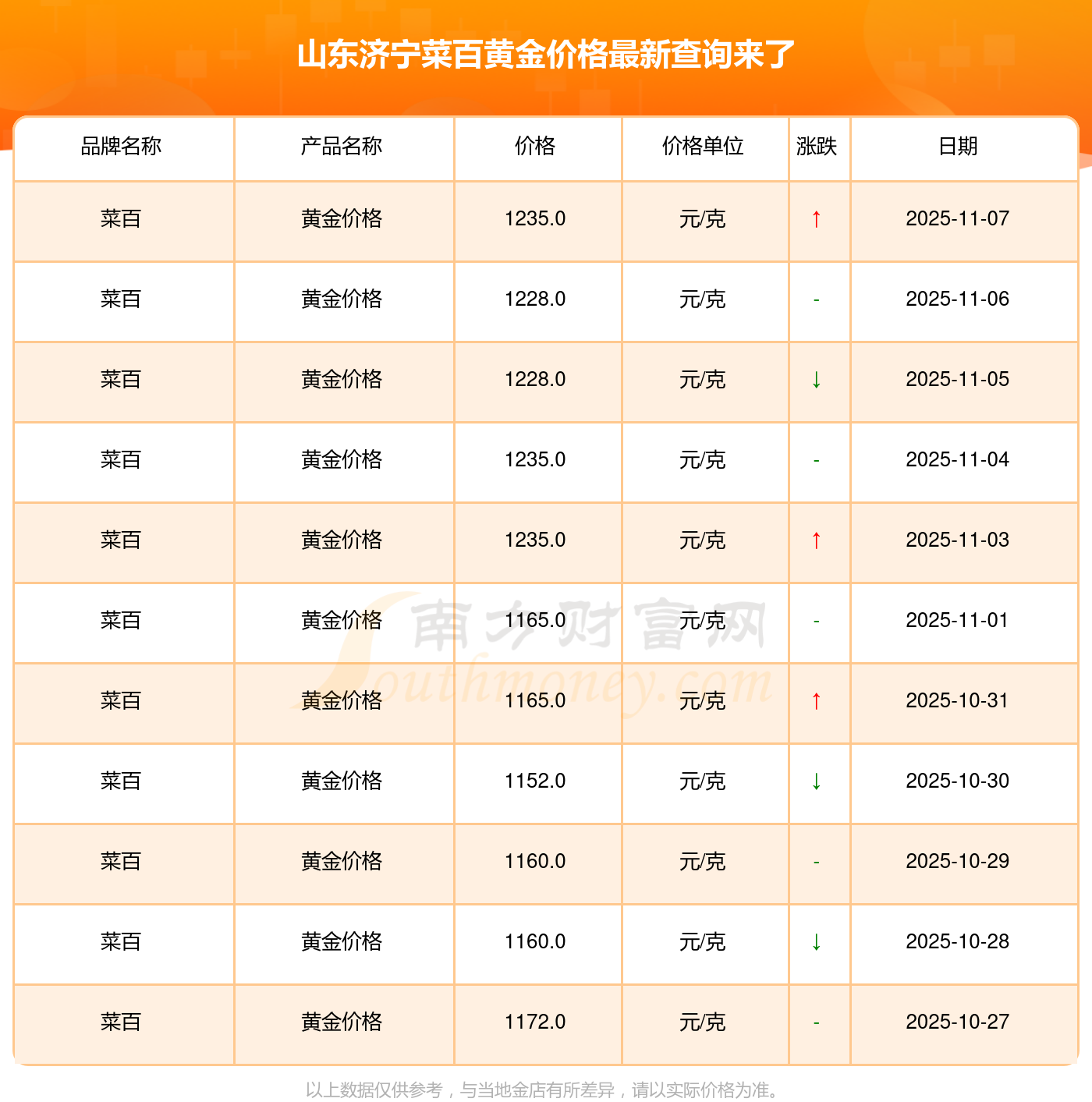 今日山東濟(jì)寧菜百黃金價格公布請問,今天黃金價格,每克是多少山東濟(jì)寧菜百黃金價格在 2025年11月8日,其市場價格為 1235.0元/克。