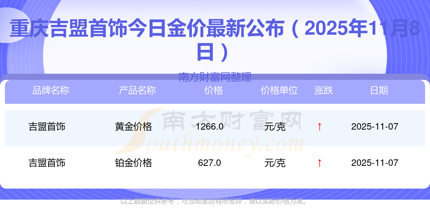 想知道今日黃金價(jià)格,目前黃金一克的價(jià)錢是多少呀?2025年11月8日重慶吉盟首飾一克黃金的售價(jià)是多少:銀條價(jià)格11.4元/克,黃金價(jià)格1263.0元/克,鉑金價(jià)格560.0元/克,金條價(jià)格(內(nèi)地)1202.0元/克,金飾價(jià)格(內(nèi)地)1268.0元/克,黃金飾品(香港)44260.0,鉑金飾品(香港)13080.0,金條金價(jià)(香港)39960.0,投資金條1243.0元/克,工藝金條1258.0元/克,千足金首飾1248.0元/克。