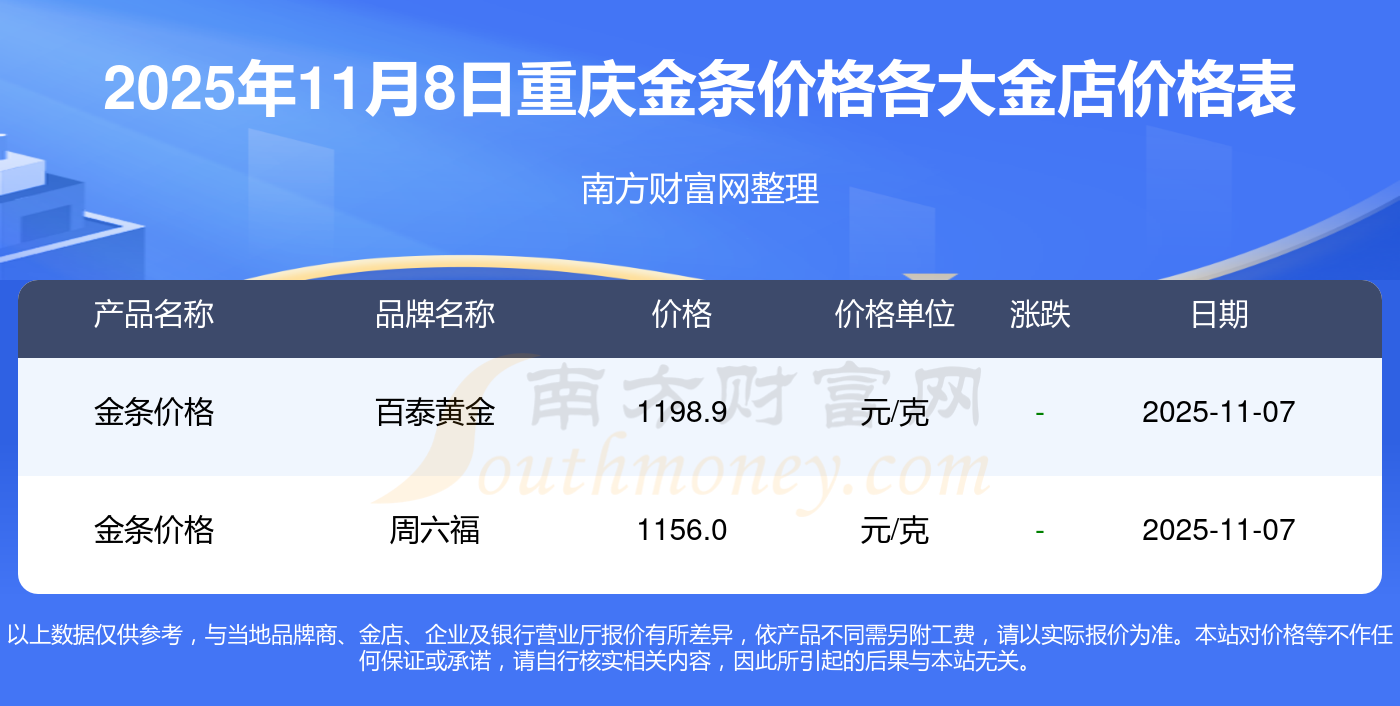 2025年11月8日重慶各大金店金條價格最新價格:寶泉錢幣11.4元/克,金蘭首飾1263.0元/克,金蘭首飾560.0元/克,謝瑞麟1202.0元/克,謝瑞麟1268.0元/克,謝瑞麟44260.0,謝瑞麟13080.0,謝瑞麟39960.0,金銀街1243.0元/克,金銀街1258.0元/克,金銀街1248.0元/克。