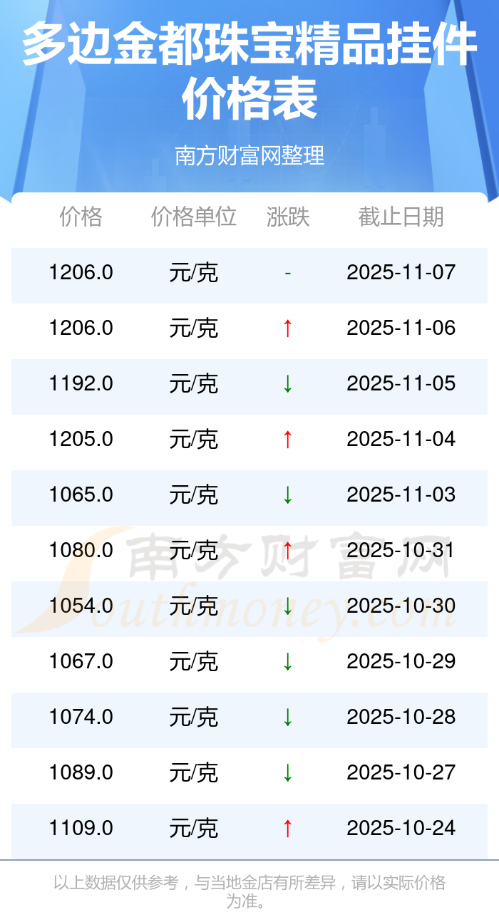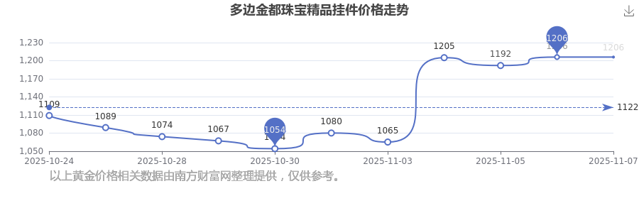 今日(2025年11月8日)多邊金都珠寶精品掛件的價格為1206.0元/克。