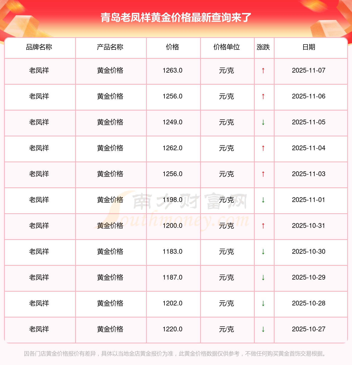 青島老鳳祥黃金價(jià)格現(xiàn)在一克多少錢?今天購買一克黃金需要多少錢?今日青島老鳳祥黃金價(jià)格查詢,今日(2025年11月8日)青島老鳳祥黃金價(jià)格:1263.0元/克。