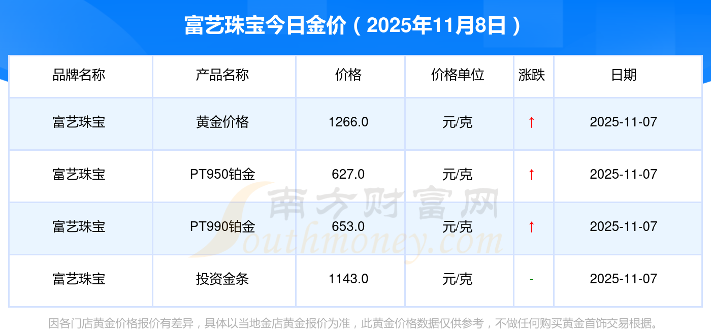富藝珠寶金價(jià)今日價(jià)格:銀條價(jià)格11.4元/克,黃金價(jià)格1263.0元/克,鉑金價(jià)格560.0元/克,金條價(jià)格(內(nèi)地)1202.0元/克,金飾價(jià)格(內(nèi)地)1268.0元/克,黃金飾品(香港)44260.0,鉑金飾品(香港)13080.0,金條金價(jià)(香港)39960.0,投資金條1243.0元/克,工藝金條1258.0元/克,千足金首飾1248.0元/克。