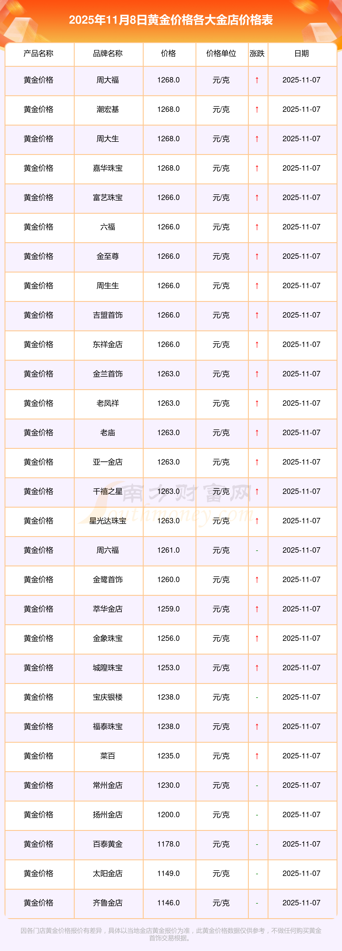 2025年11月8日寶泉錢幣、金蘭首飾、金蘭首飾、謝瑞麟、謝瑞麟、謝瑞麟、謝瑞麟、謝瑞麟、金銀街、金銀街、金銀街等各大金店品牌黃金價(jià)格最新價(jià)格如下:寶泉錢幣銀條價(jià)格11.4元/克,金蘭首飾黃金價(jià)格1263.0元/克,金蘭首飾鉑金價(jià)格560.0元/克,謝瑞麟金條價(jià)格(內(nèi)地)1202.0元/克,謝瑞麟金飾價(jià)格(內(nèi)地)1268.0元/克,謝瑞麟黃金飾品(香港)44260.0,謝瑞麟鉑金飾品(香港)13080.0,謝瑞麟金條金價(jià)(香港)39960.0,金銀街投資金條1243.0元/克,金銀街工藝金條1258.0元/克,金銀街千足金首飾1248.0元/克。