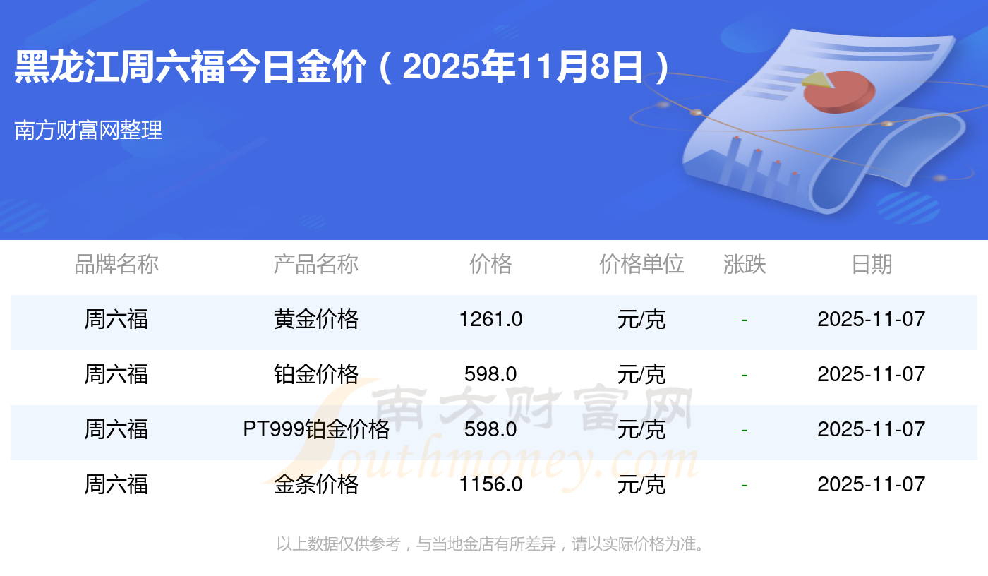 2025年11月8日黑龍江周六福一克黃金的售價(jià)是多少:銀條價(jià)格11.4元/克,黃金價(jià)格1263.0元/克,鉑金價(jià)格560.0元/克,金條價(jià)格(內(nèi)地)1202.0元/克,金飾價(jià)格(內(nèi)地)1268.0元/克,黃金飾品(香港)44260.0,鉑金飾品(香港)13080.0,金條金價(jià)(香港)39960.0,投資金條1243.0元/克,工藝金條1258.0元/克,千足金首飾1248.0元/克。