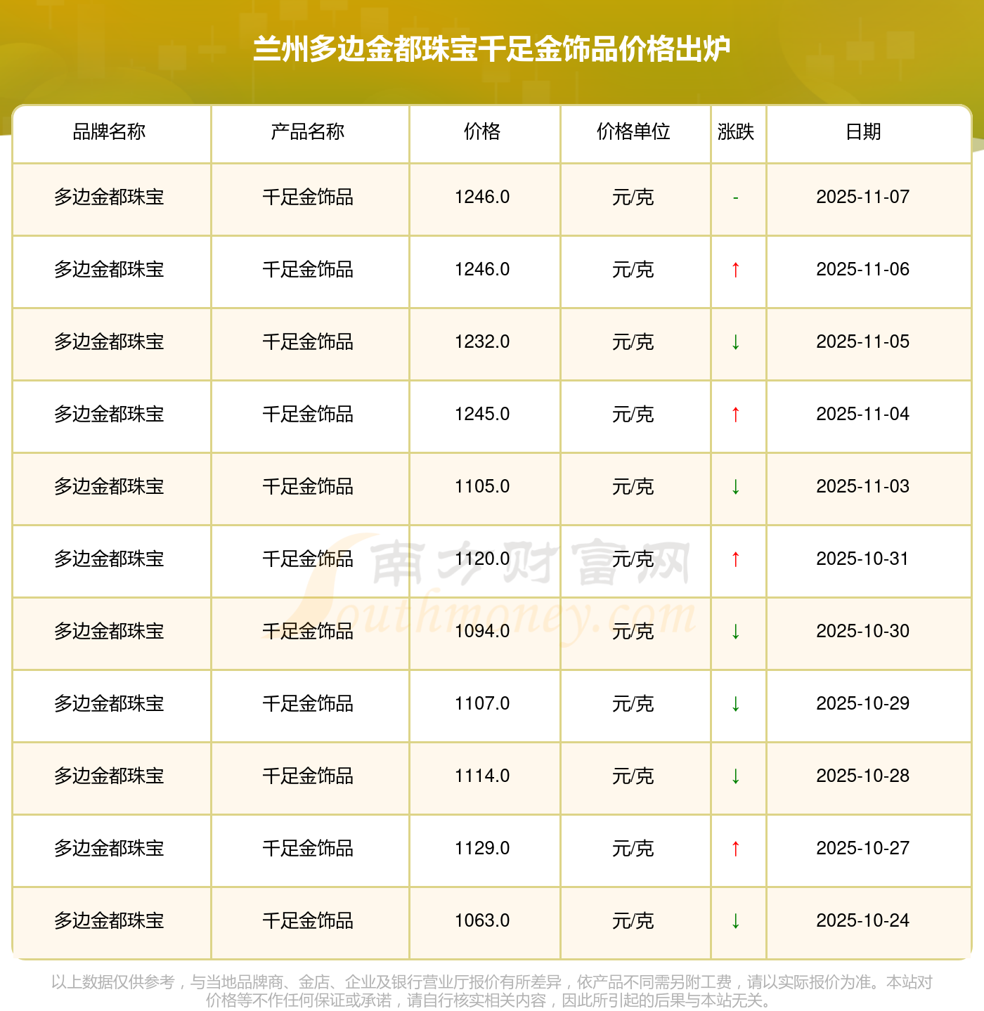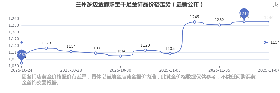今日蘭州多邊金都珠寶千足金飾品價格為1246.0元/克。