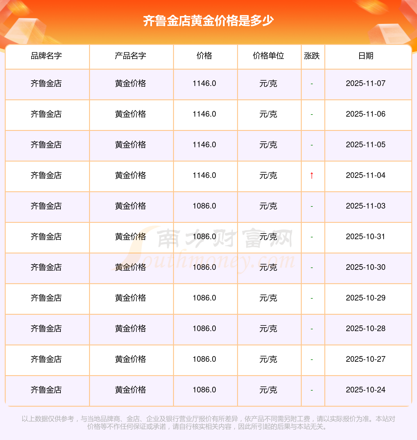 今天黃金價(jià)格是多少?現(xiàn)在黃金一克的價(jià)錢是怎樣的?通常情況下黃金每一克的價(jià)格大概是多少呢?今日(2025年11月8日)齊魯金店黃金價(jià)格為1146.0元/克。