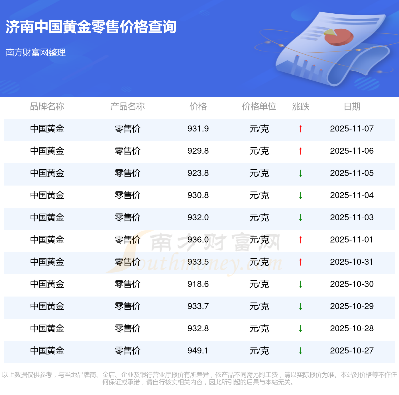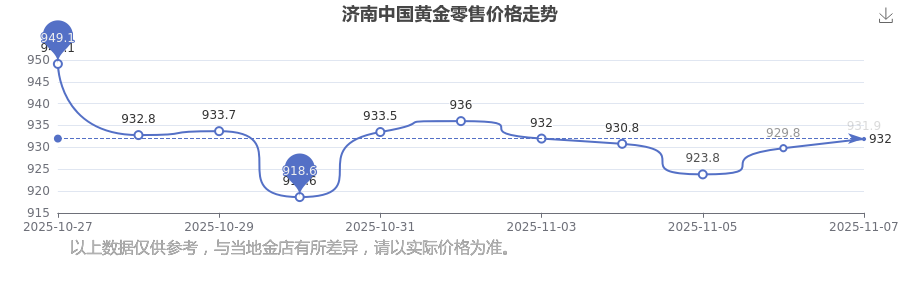 2025年11月8日,濟南中國黃金所售零售價,其價格設(shè)定為 931.9元/克。