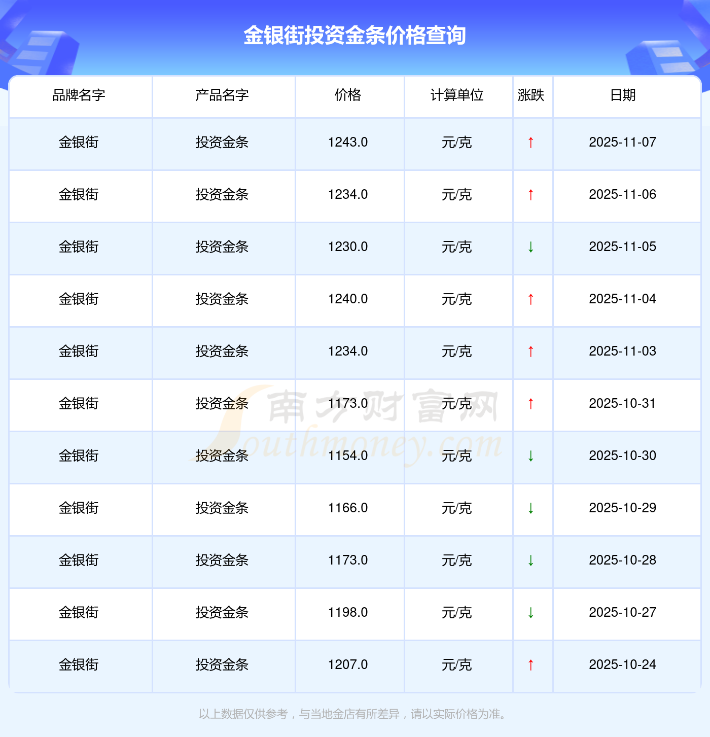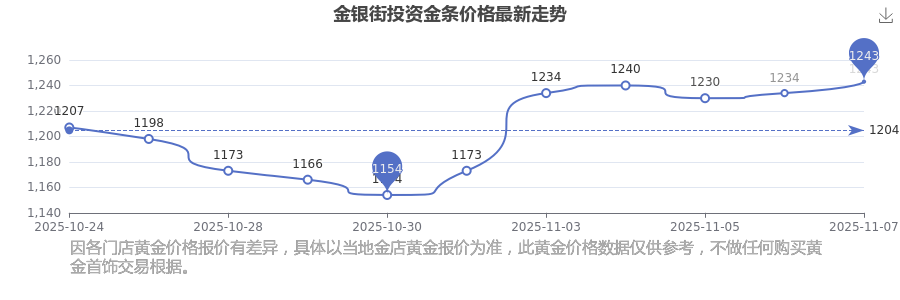 1243.0元/克是金銀街在今日給出的 投資金條最新價(jià)格。
