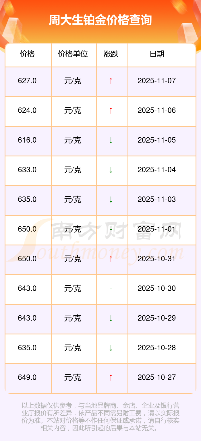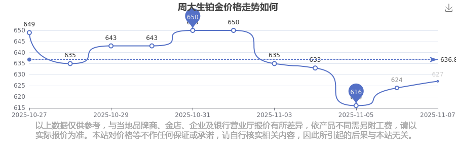 2025年11月8日周大生鉑金價格:627.0元/克。