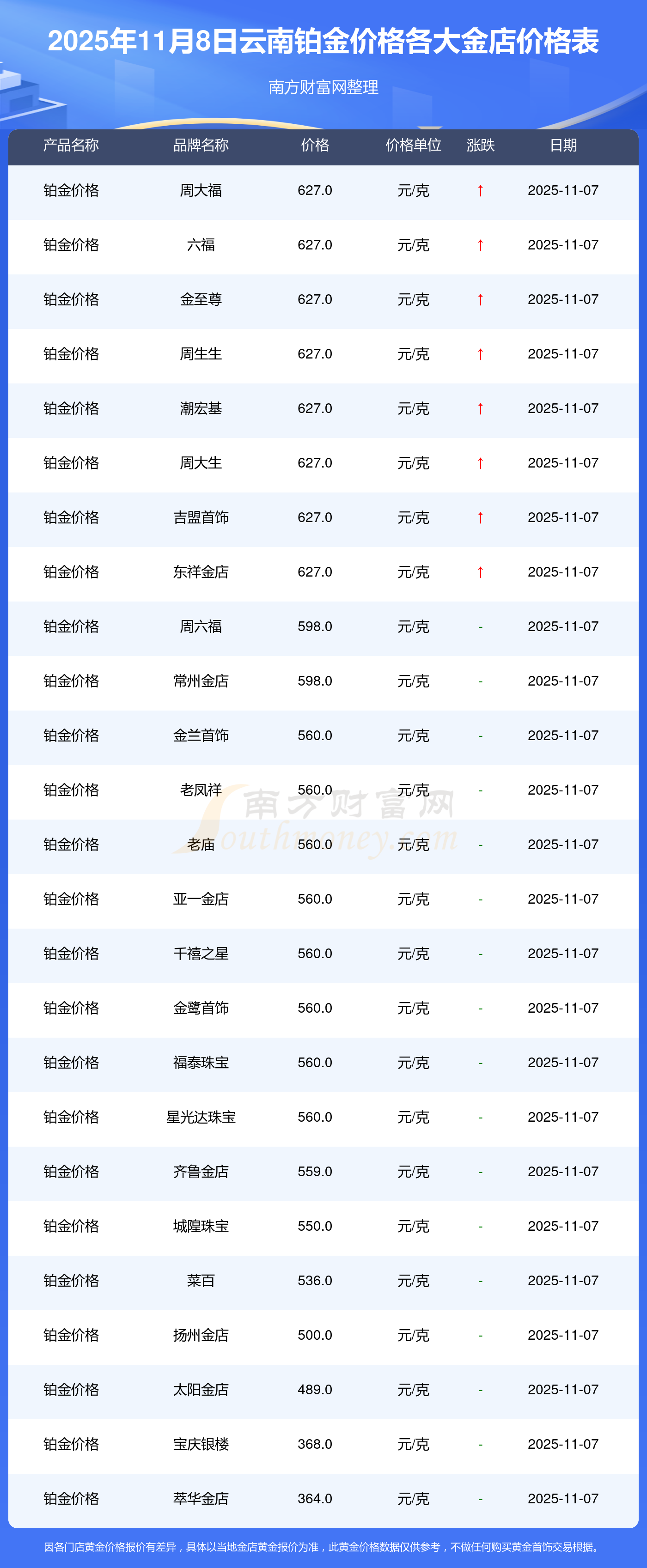 2025年11月8日云南各大金店鉑金價(jià)格最新價(jià)格:寶泉錢幣11.4元/克,金蘭首飾1263.0元/克,金蘭首飾560.0元/克,謝瑞麟1202.0元/克,謝瑞麟1268.0元/克,謝瑞麟44260.0,謝瑞麟13080.0,謝瑞麟39960.0,金銀街1243.0元/克,金銀街1258.0元/克,金銀街1248.0元/克。