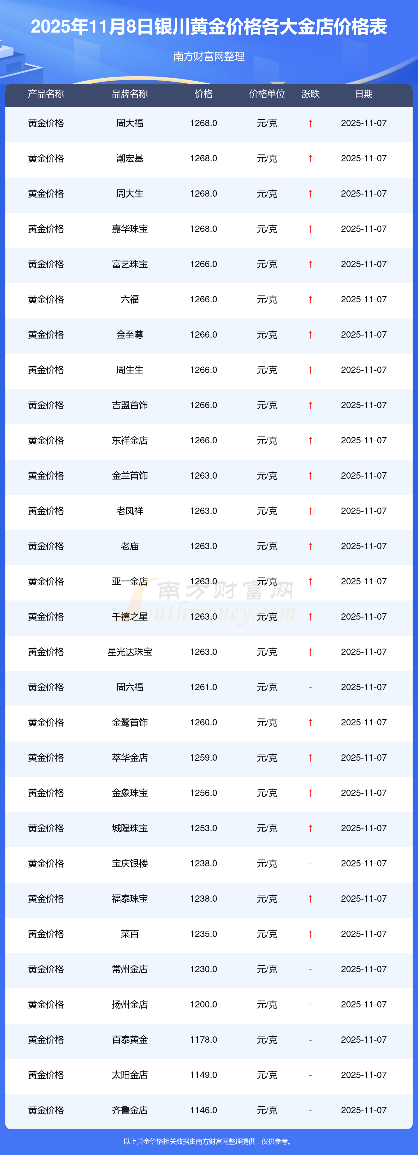 今天是2025年11月8日,銀川寶泉錢幣、金蘭首飾、金蘭首飾、謝瑞麟、謝瑞麟、謝瑞麟、謝瑞麟、謝瑞麟、金銀街、金銀街、金銀街等各大金店品牌黃金價(jià)格最新價(jià)格如下:寶泉錢幣11.4元/克、金蘭首飾1263.0元/克、金蘭首飾560.0元/克、謝瑞麟1202.0元/克、謝瑞麟1268.0元/克、謝瑞麟44260.0、謝瑞麟13080.0、謝瑞麟39960.0、金銀街1243.0元/克、金銀街1258.0元/克、金銀街1248.0元/克。