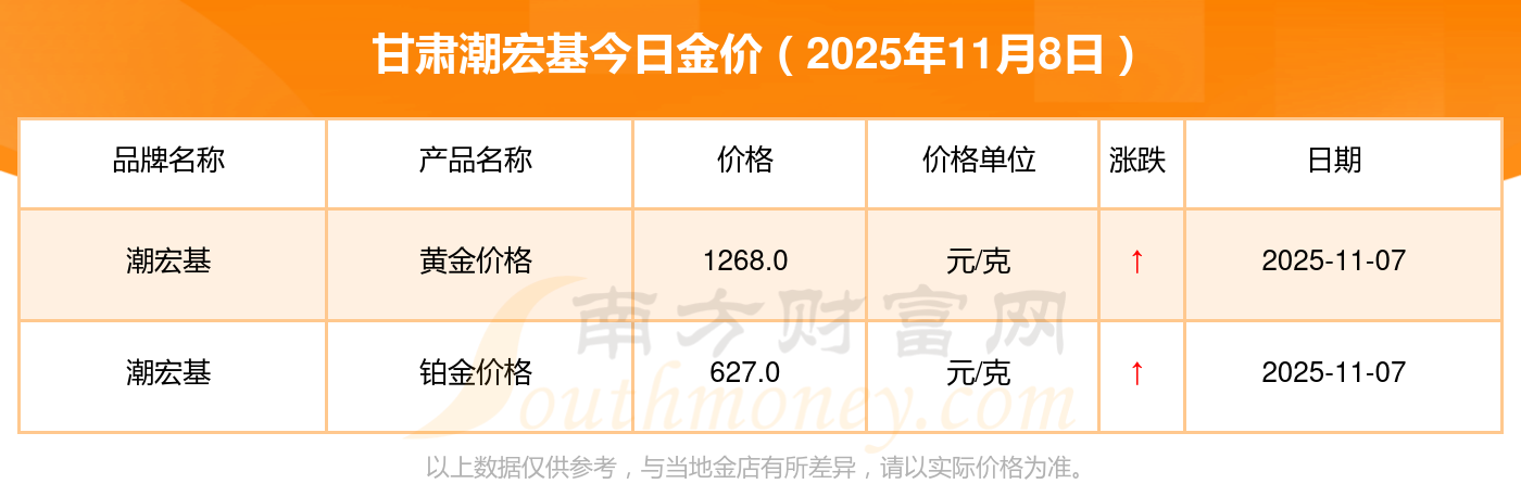 2025年11月8日甘肅潮宏基金價(jià)查詢:銀條價(jià)格11.4元/克,黃金價(jià)格1263.0元/克,鉑金價(jià)格560.0元/克,金條價(jià)格(內(nèi)地)1202.0元/克,金飾價(jià)格(內(nèi)地)1268.0元/克,黃金飾品(香港)44260.0,鉑金飾品(香港)13080.0,金條金價(jià)(香港)39960.0,投資金條1243.0元/克,工藝金條1258.0元/克,千足金首飾1248.0元/克。