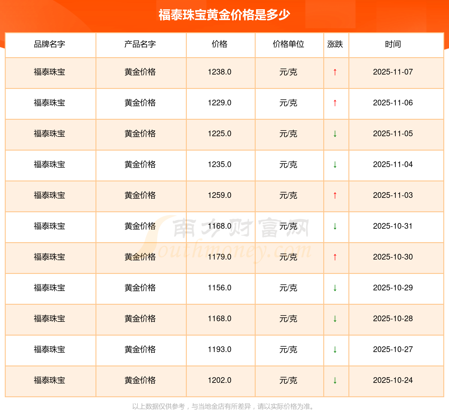 想知道當(dāng)下黃金價(jià)格,今天黃金一克賣多少錢呢?一克黃金的價(jià)格會是多少呢?今日(2025年11月8日),福泰珠寶黃金價(jià)格最新價(jià)格是1238.0元/克。