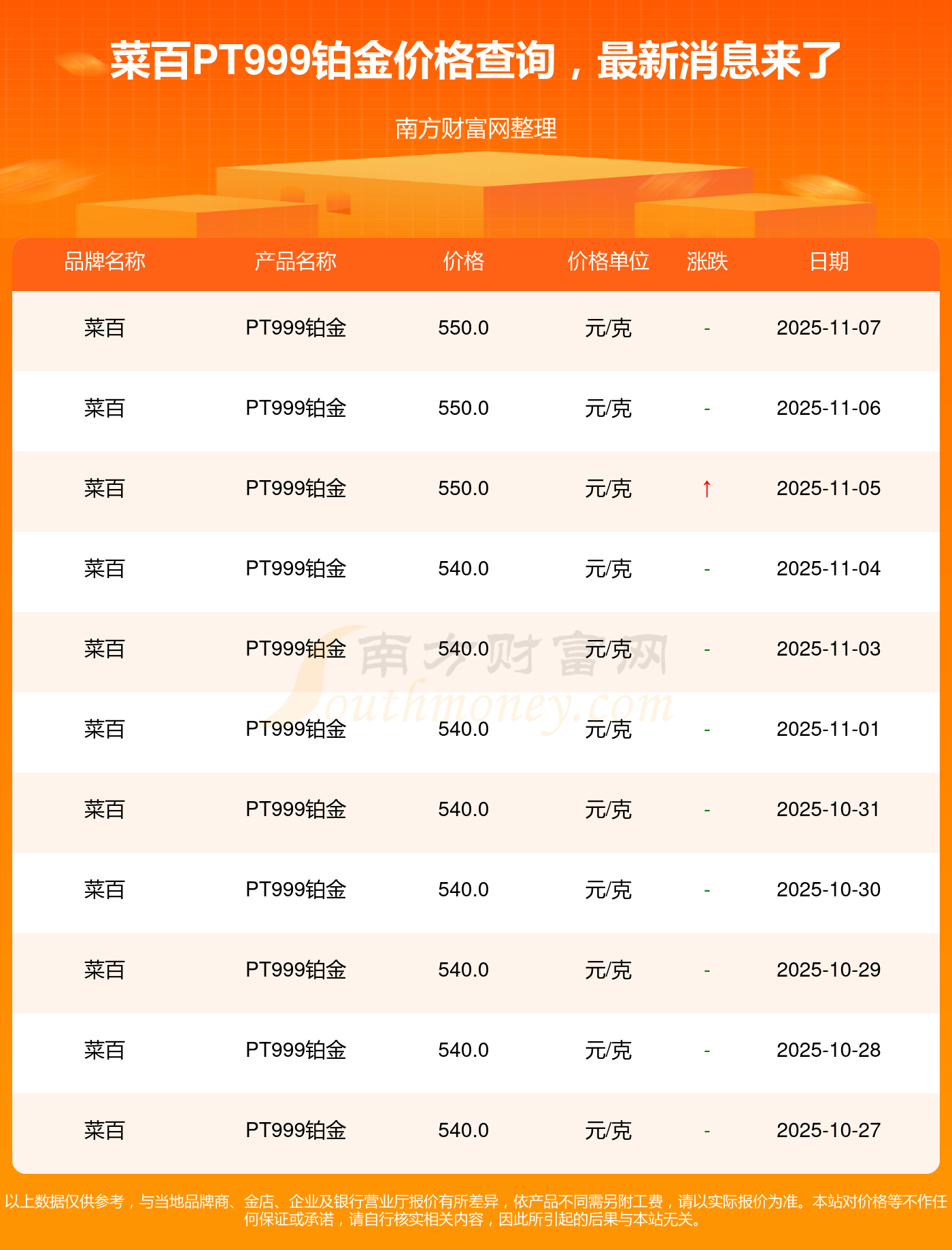 今日菜百PT999鉑金最新價(jià)格為550.0元/克。